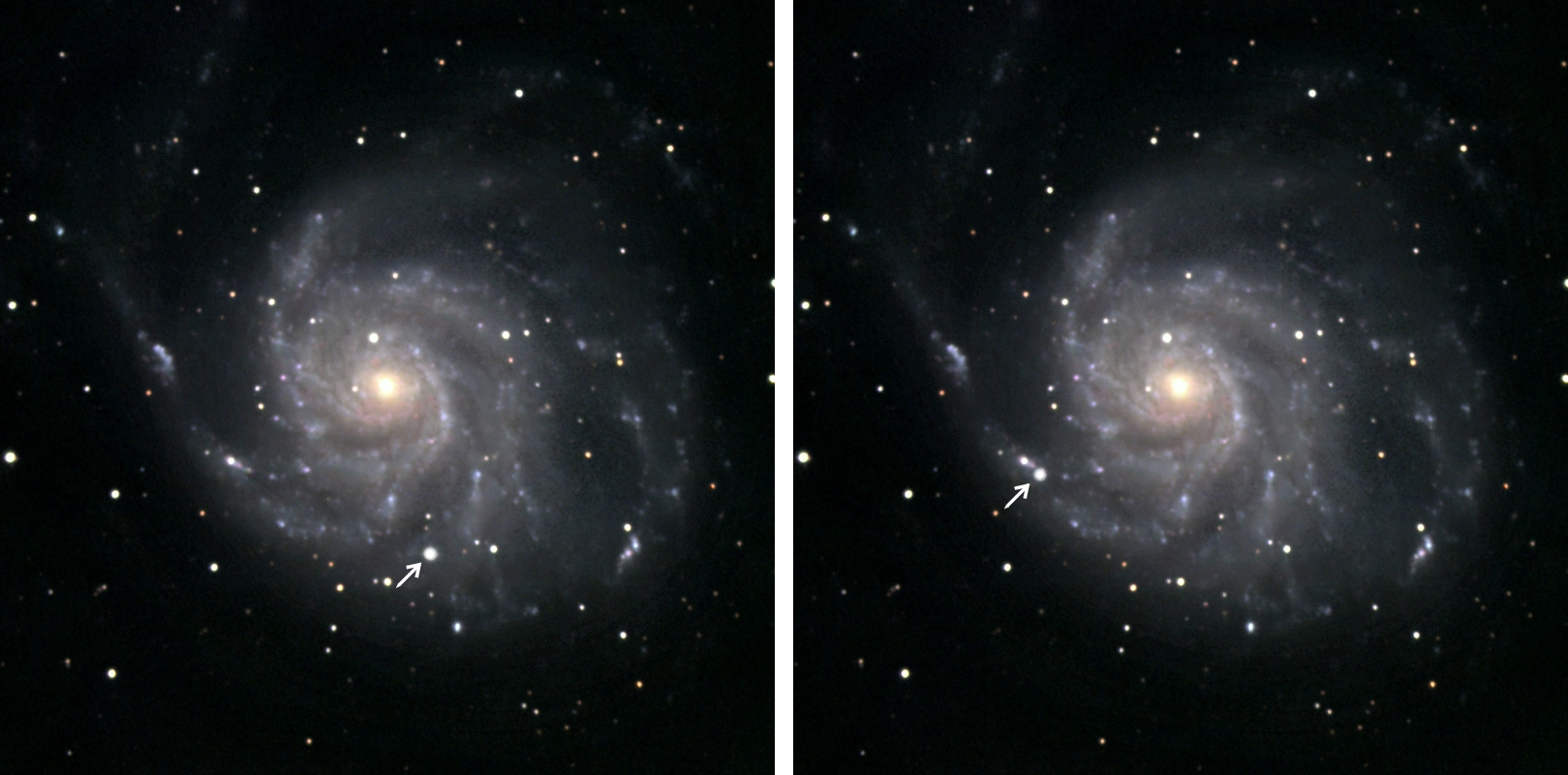 Die beiden hellen Supernovae SN 2023ixf (rechts) und SN 2011fe (links) in der Feuerrad-Galaxie M 101, aufgenommen am 2. Juni 2023 bzw. am 5. September 2011. Die Bilder sind Farb-Komposit-Aufnahmen, die aus Bildern im B-, V- und R-Band zusammengesetzt wurden.