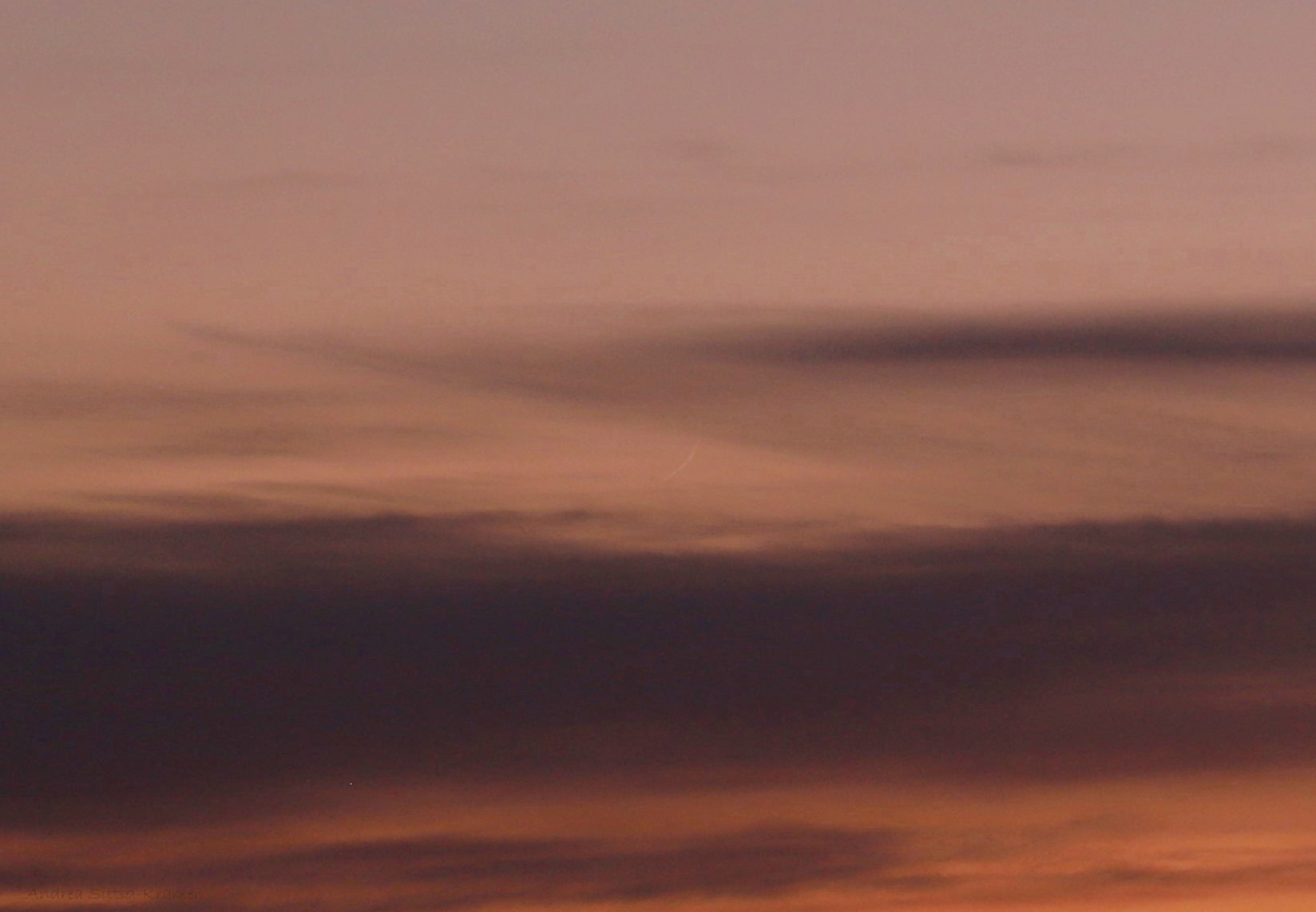 Am 25. März 2020, einen Tag nach Neumond, erstrahlte der Westhimmel bei Uelzen in einem wunderschönen, farbintensiven Abendrot. Ein ausgeprägtes Wolkenband in Horizontnähe verlieh dem ansonsten völlig Wolken freien Himmel etwas Malerisches. Leider konnte ich dadurch aber den jungen Mond visuell nicht finden. Umso erfreuter war ich, als ich bei der genaueren Sichtung am großen PC-Bildschirm, die superschmale Mondsichel auf einem Foto entdeckte. Der einen Tag alte Erdtrabant war um 19:07 Uhr nur zu 1,8 Prozent beleuchtet!