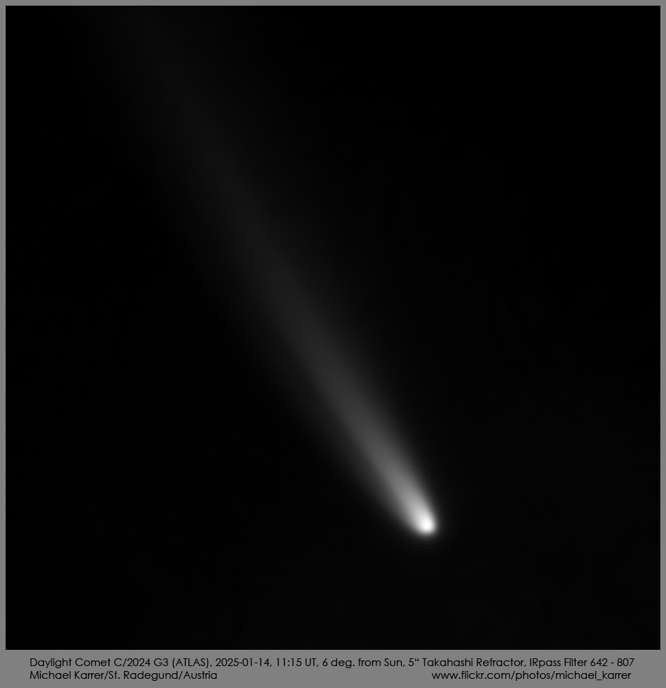 Ein Komet am Tageshimmel! ATLAS kommt zwar nicht an die beeindruckende Sichtbarkeit von McNaught im Frühjahr 2007 heran, aber eine Tagessichtbarkeit ist etwas ganz Besonderes und Seltenes. Noch dazu bei einem Abstand zur Sonne von nur sechs Grad. Um möglichst hohen Kontrast zu erreichen, kombinierte ich verschiedene Infrarot-Pass-Filter und Belichtungszeiten. IRpass deshalb, um das Himmelsblau zu unterdrücken. Das Ergebnis sieht dann zwar nach einer Nachtaufnahme aus, aber eine mögliche Schweifstruktur ist so leichter zu erkennen.
