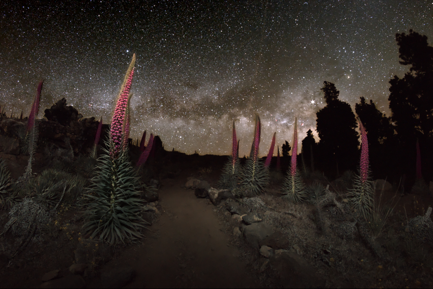 Es ist ein Naturspektakel. Etwas unterhalb der Sternwarte auf dem Roque de los Muchachos auf La Palma blüht von Mai bis August eine besondere Pflanzenart: Die rosafarbene Tajinaste, oder Wildprets Natternkopf. Die Pflanzen stehen unter Naturschutz und können bis zu drei Meter hoch werden. Sie kommt in dieser Farbe nur auf dem Kraterrand der "Caldera de Taburiente" auf La Palma sowie auf Teneriffa vor. Im Hintergrund wölbt sich die Milchstraße über das Blumenfeld.