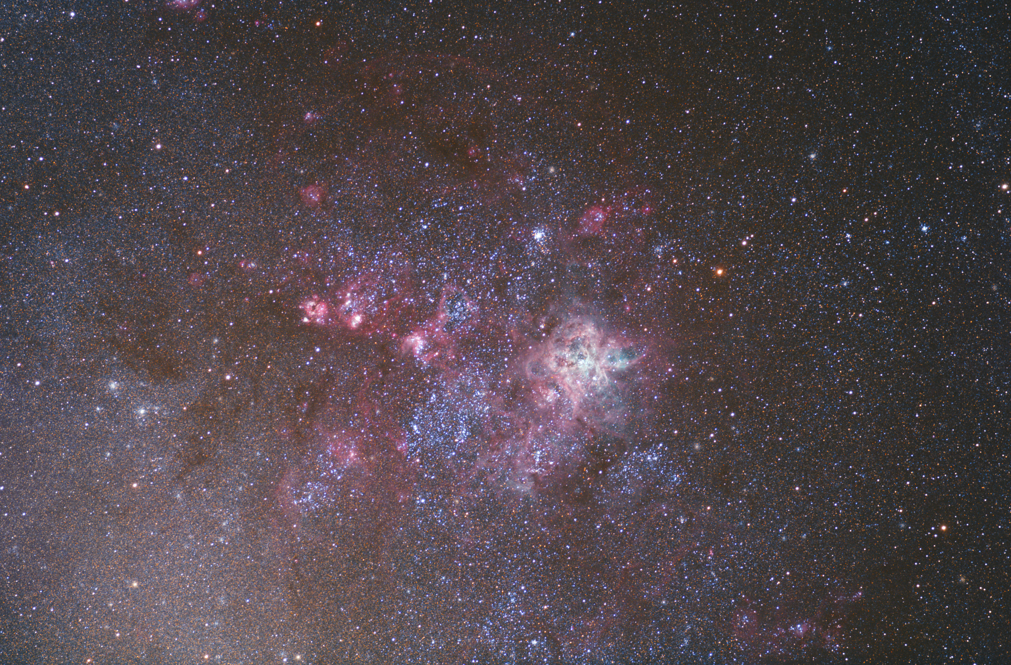 Der Tarantelnebel mit den ihn umgebenden Emissionsnebeln in der Großen Magellanschen Wolke.