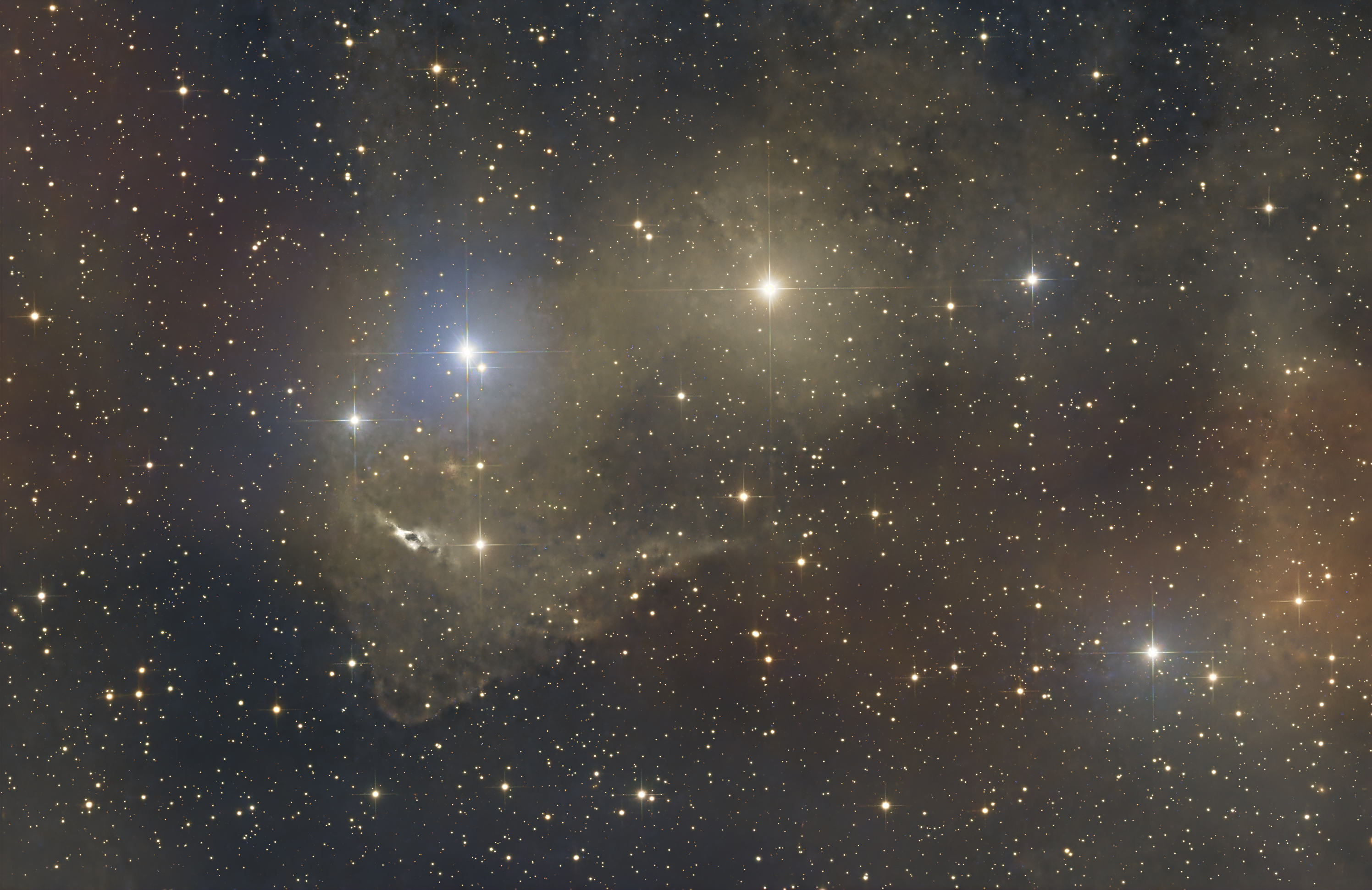 Das Bild zeigt einen Teilbereich der Molekülwolke LBN 437 im Sternbild Eidechse. Dieser Bereich aus Dunkel- und Reflexionsnebeln ist 1200 Lichtjahre entfernt.