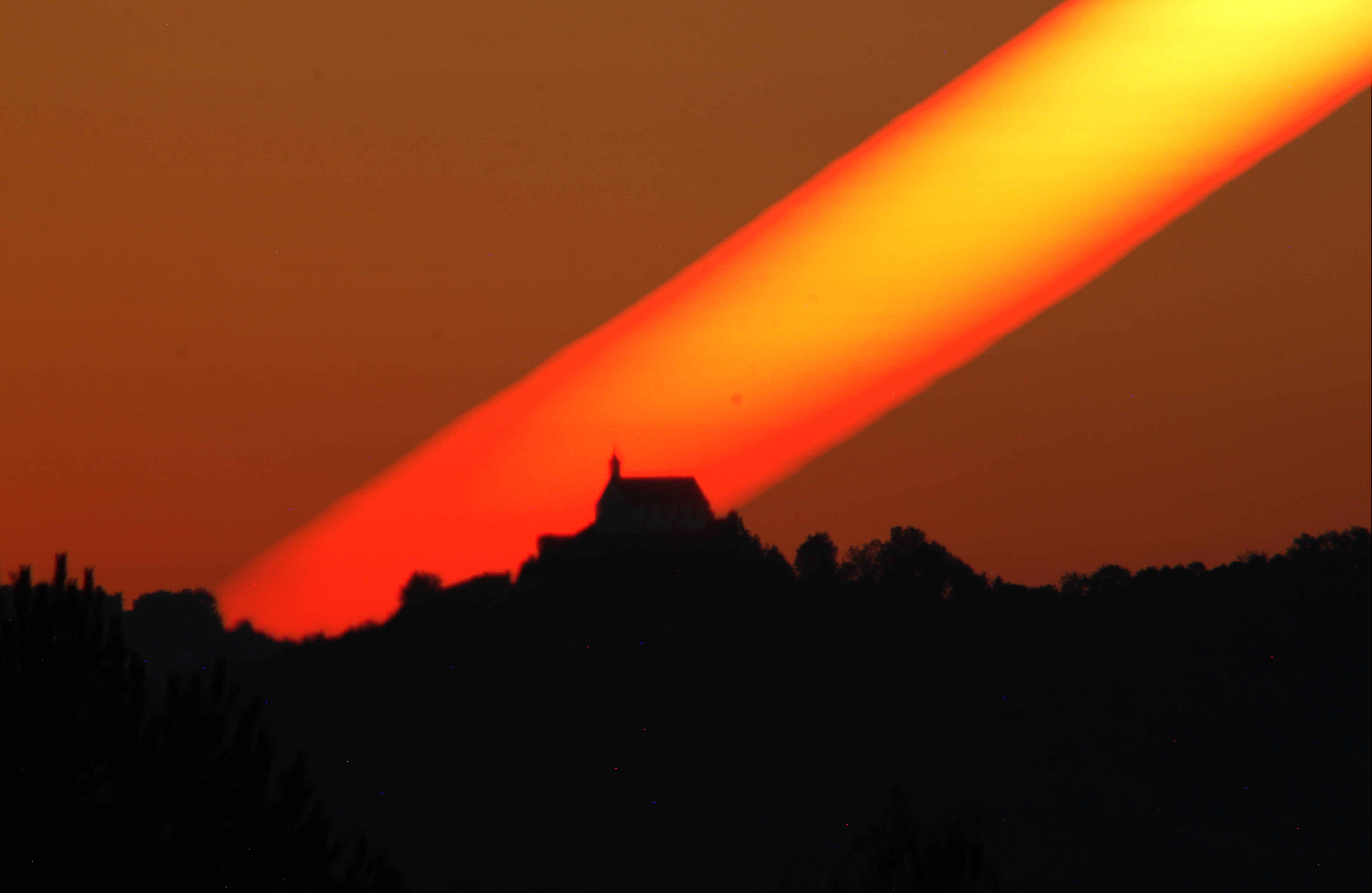 Nur wenige Tage um die Sommersonnenwende herum ist es möglich, den Sonnenaufgang hinter der bekannten Wurmlinger Kapelle aus einer Distanz von mehr als 5 km aufzunehmen, so daß die scheinbare Größe der Sonnenscheibe über der der Kapelle liegt.