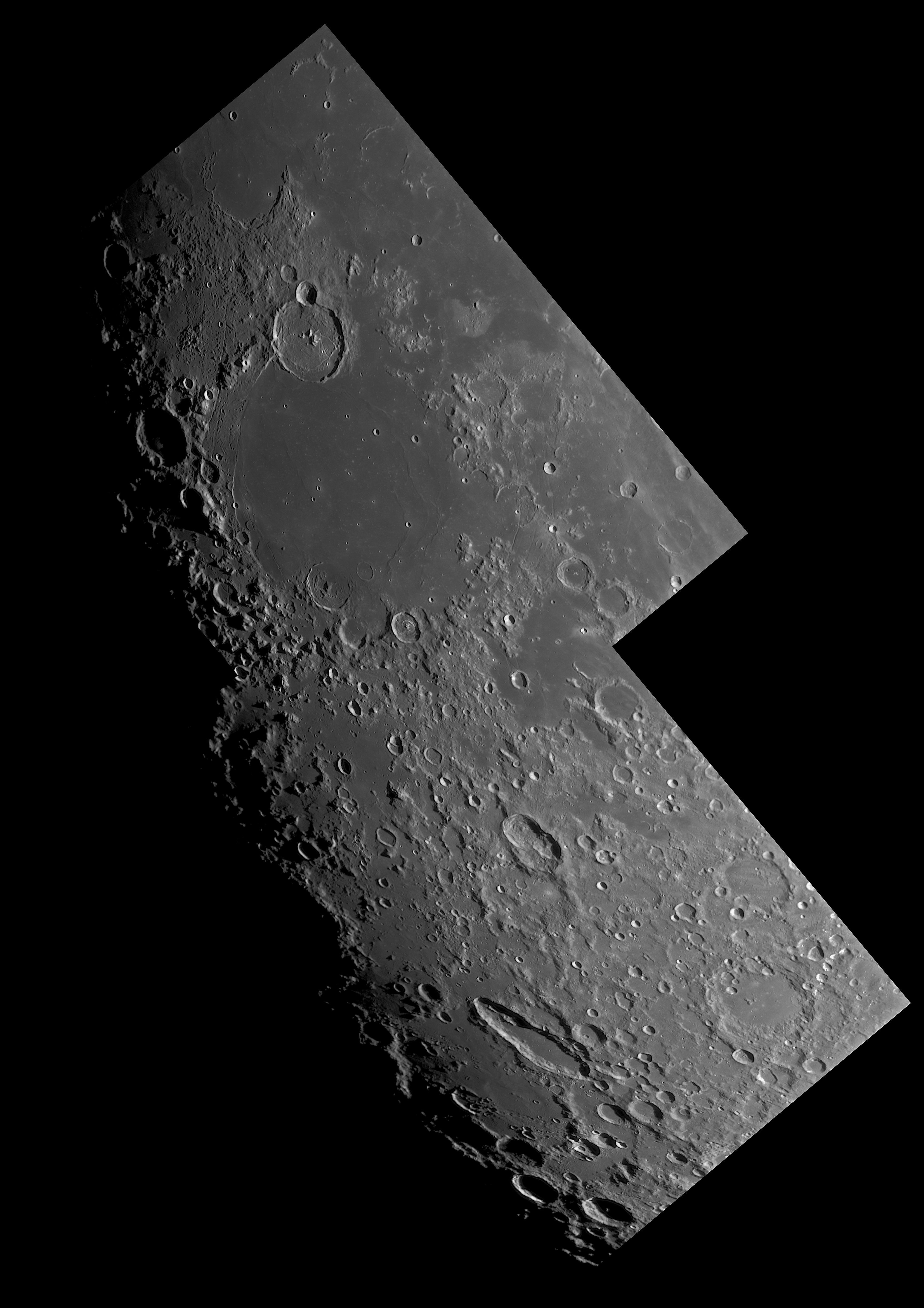 Dieses Mosaik aus zwei Aufnahmen zeigt den Terminator zwischen Gassendi und Schiller. Eine wunderschöne Gegend mit vielen besonderen Kratern und geologischen Strukturen.