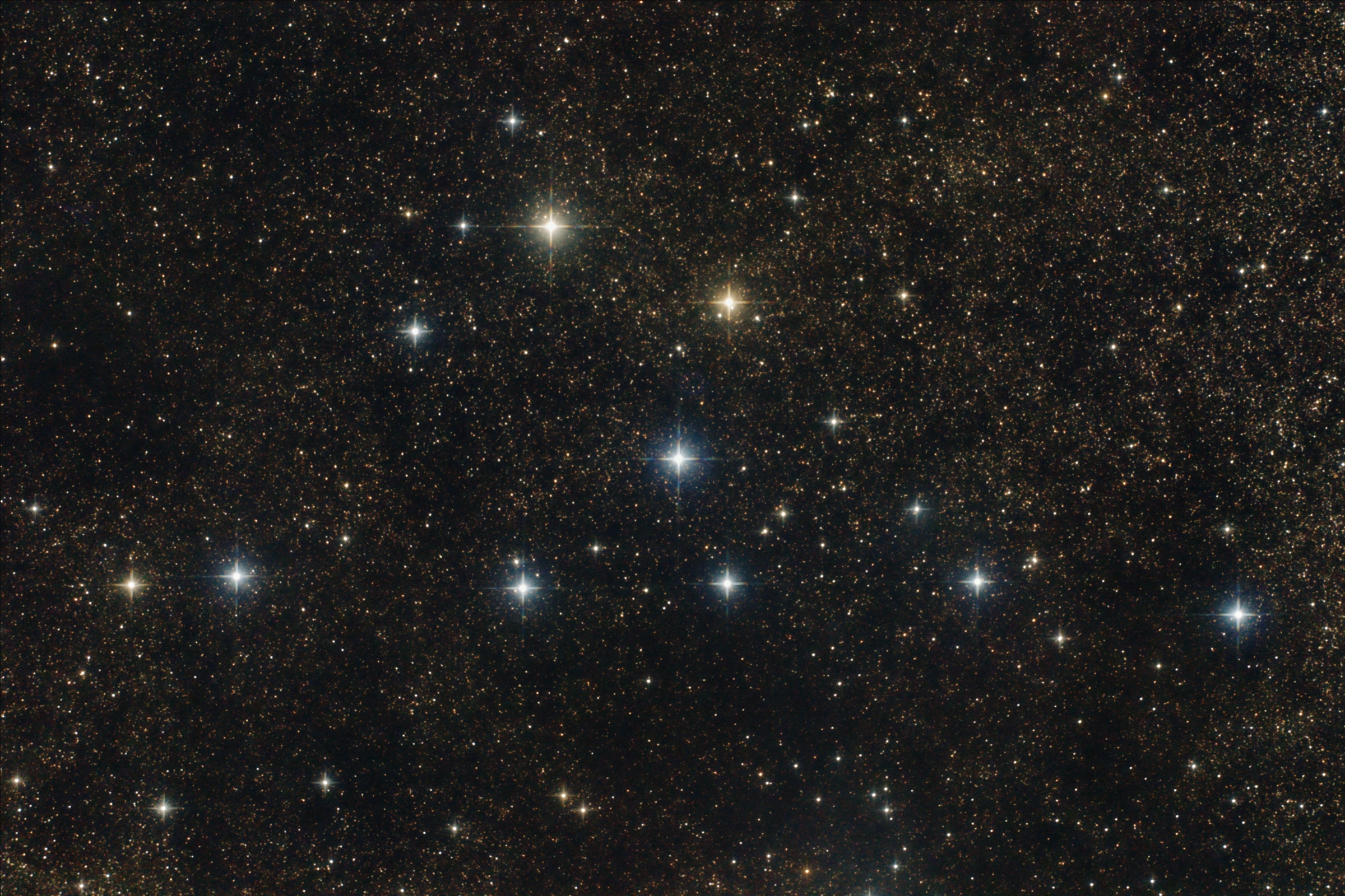 "The Coathanger" or Collinder 399 (Cr 399) is an asterism: a grouping of stars that can be seen from Earth showing a peculiar alignment which in this case seems to be the shape of a coathanger. The straight line formed by six stars is the support and four stars in its south side (upwards in image) forms the hook.