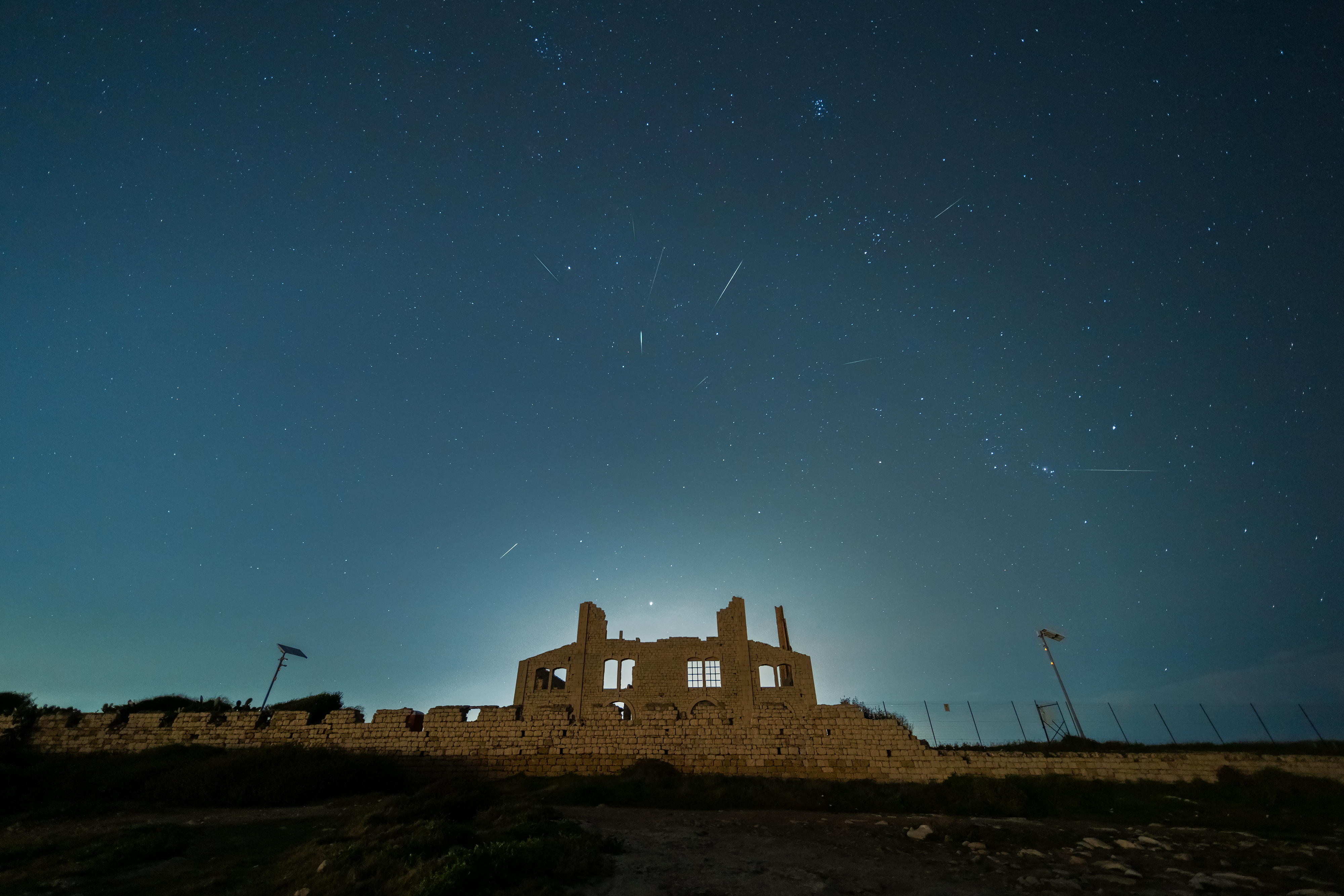 The images were captured at Fornace Penna in Sampieri, Sicily, Italy, on December 13, 2025. The image is a composite of nine shots, each with at least one Geminid (one of which had two Geminids). The exposures were taken from 9:20 PM to 11:00 PM. Jupiter is clearly visible in the image, just above Fornace Penna, with Gemini a little higher to the left; Orion is in the center right; and the Pleiades is at the top center.
