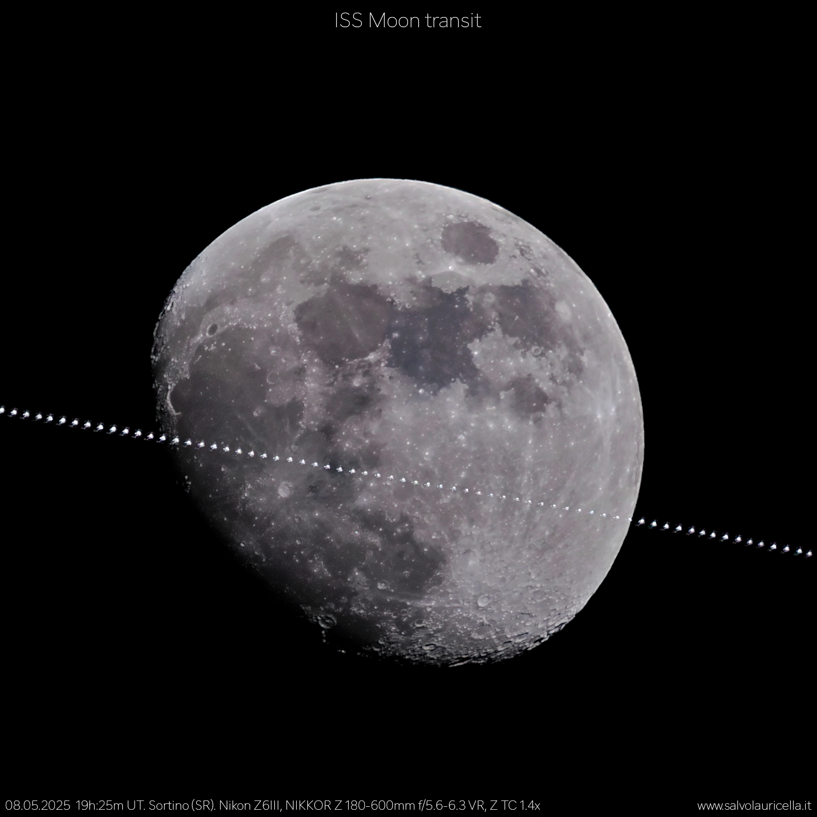The International Space Station transits the Moon. Image taken on May 8, 2025, at 19:25 UT near Sortino (SR), Italy.