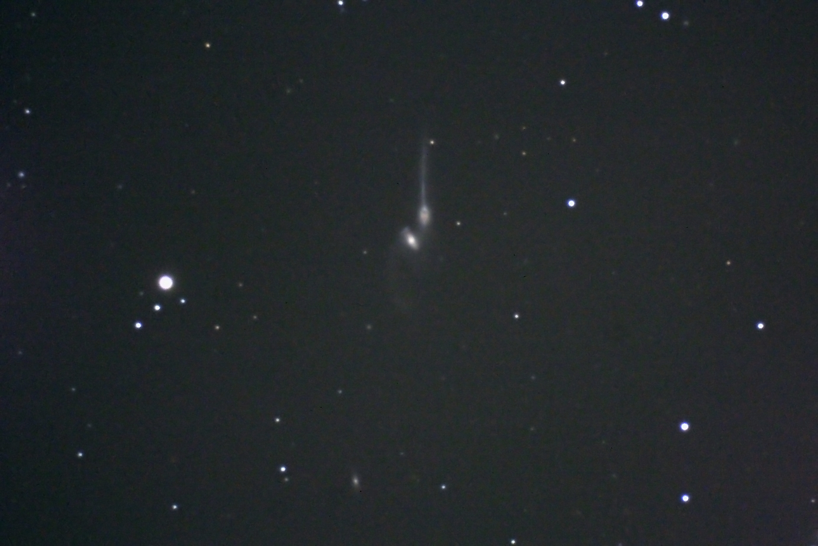 Diese beiden mächtigen Galaxien reißen sich gegenseitig auseinander. Jede Spiralgalaxie ist wahrscheinlich schon durch die andere hindurchgewandert. Wahrscheinlich werden sie wieder und wieder kollidieren, bis sie schließlich verschmelzen. Die langen Schweife werden durch den Unterschied zwischen dem gravitativen Sog auf der nahen und der fernen Seite jeder einzelnen Galaxie erzeugt.