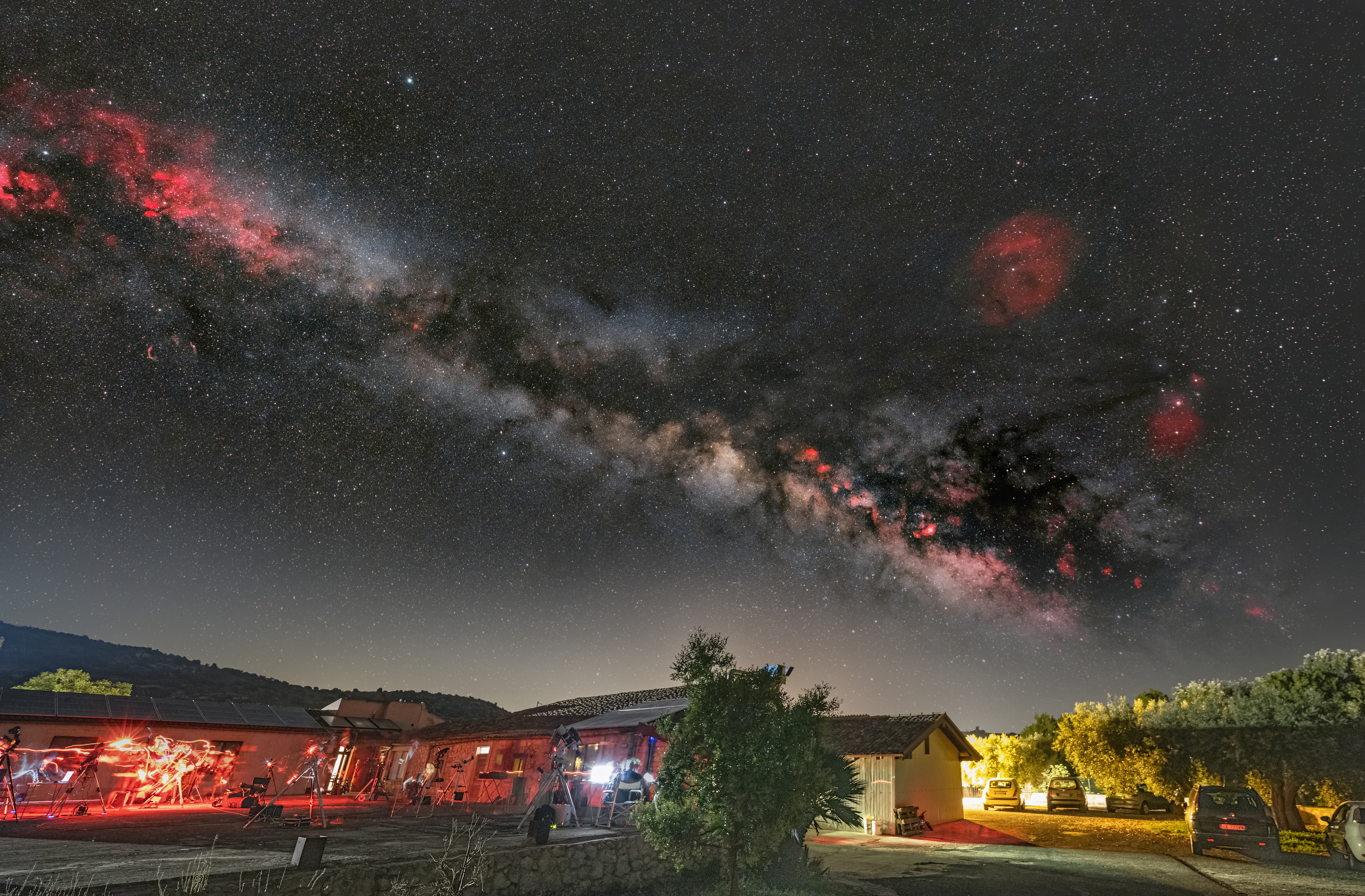 The milky way imaged over a sicilian star party. The technique used to obtain this image was to photograph the same area of the sky at the same time with two cameras (one of which was modified for astronomy and mounted on an astro tracker) with the same focal length.