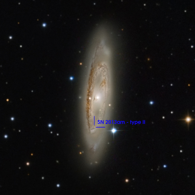 SN 2013am - Type II (References: ATEL 4910, CBAT TOCP): On 21,638 March 2013, M. Sugano, Kakogawa, Hyogo-ken, Japan reported the discovery of an apparent supernova in M65. The object received its official designation, SN 2013am (CBET 3440). The coordinates of SN 2013am are R.A. : 11h18m56.93s, Dec: +13°03'49.3". It is located 15,3" east and 103,2" south of the center of M65.