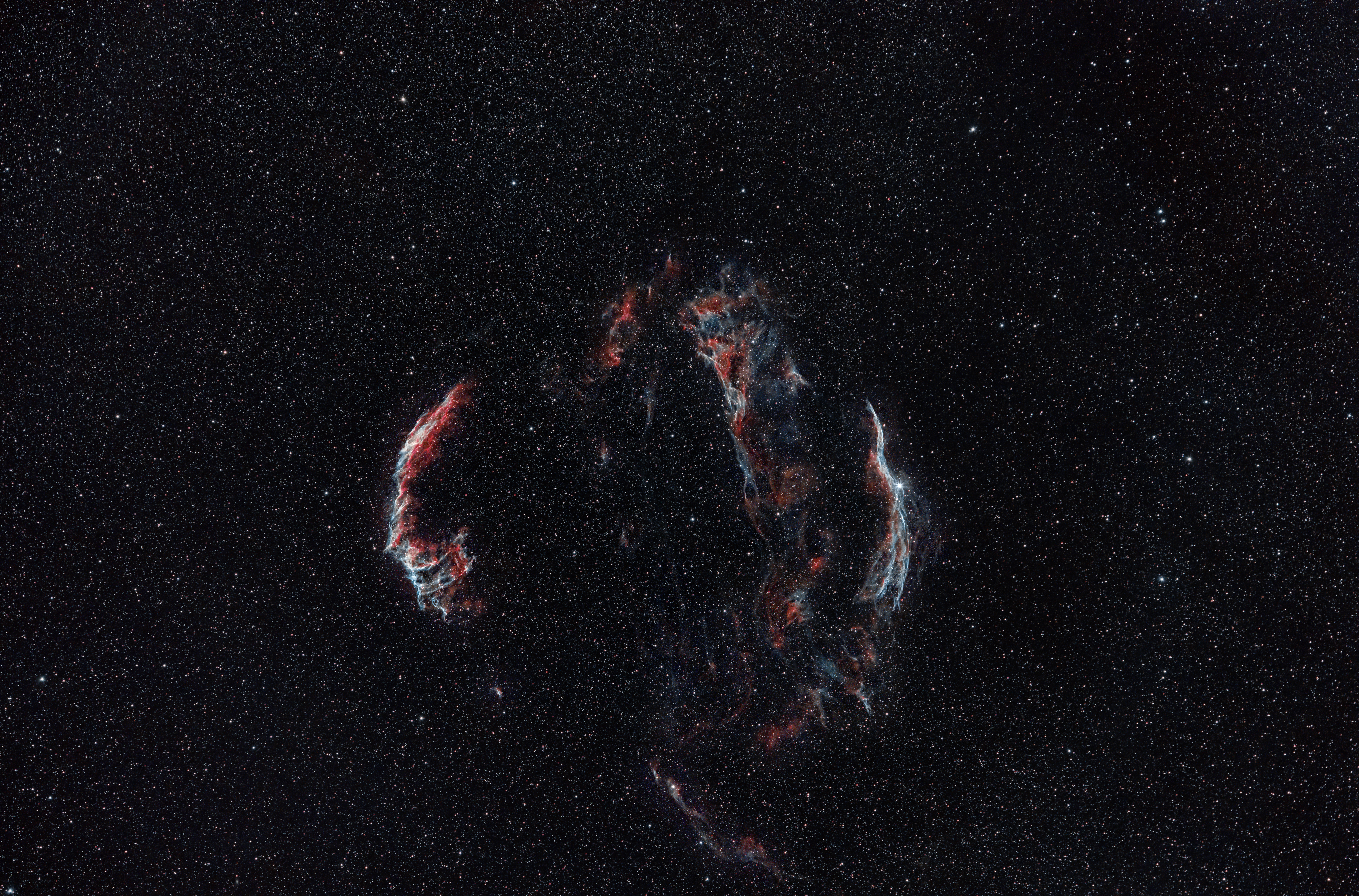 The Veil Nebula is a gigantic Supernova remnant divided into several sections that constitute the Cygnus Loop.