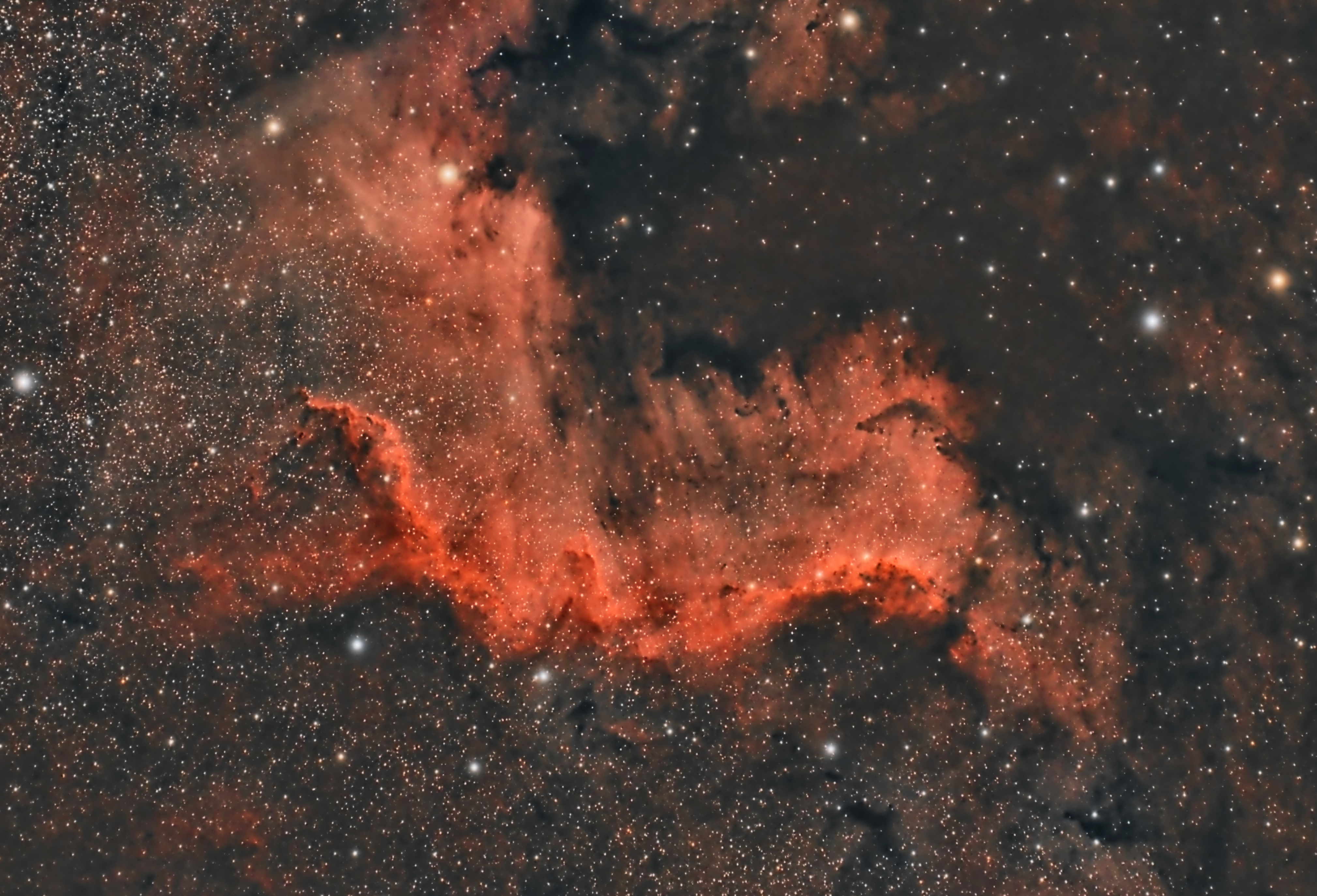 Dies ist ein Ausschnitt aus NGC 7000 - quasi der westliche Teil von "Mexiko", interessant ist die räumliche Wirkung