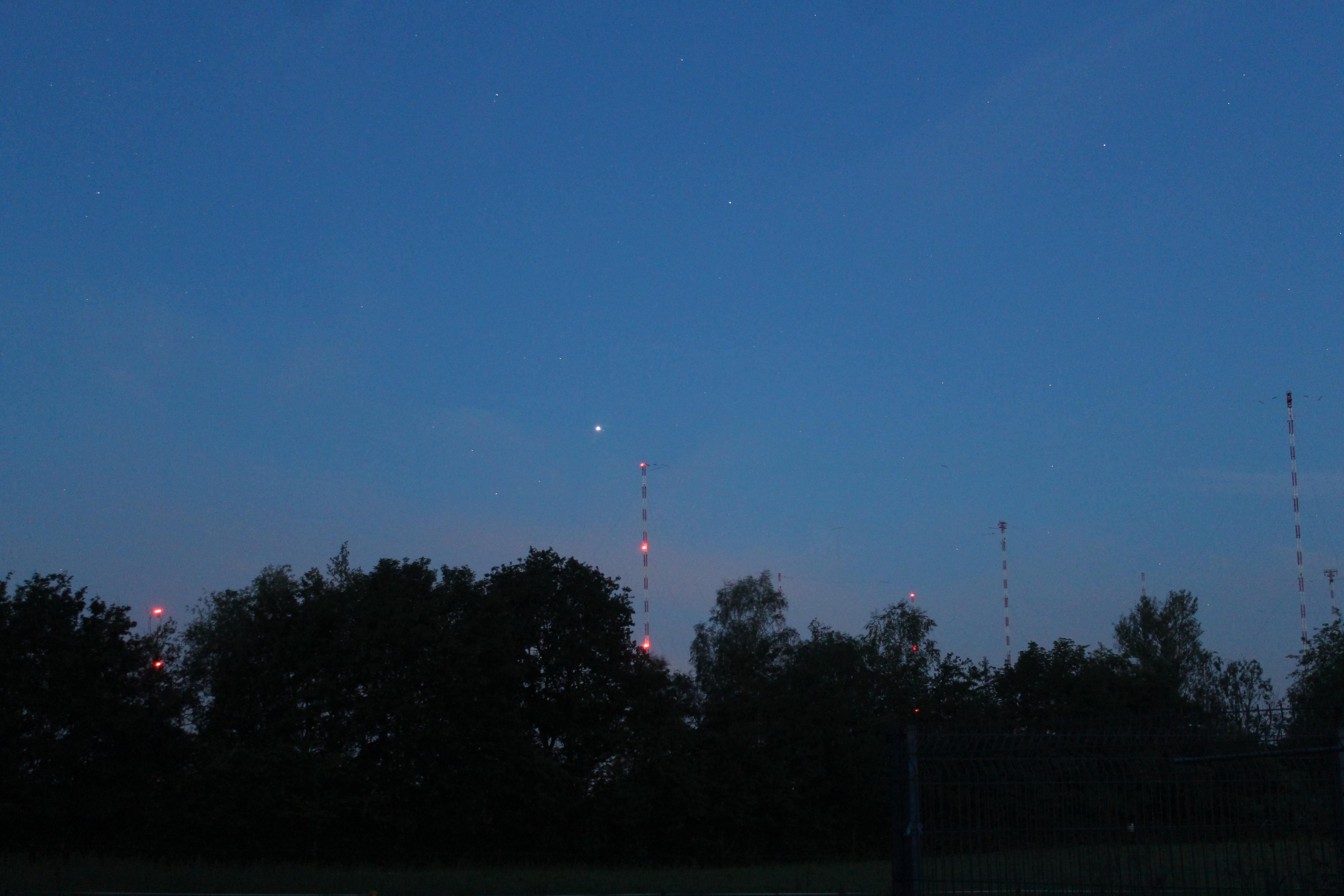 Der Langwellensender Mainflingen, der unter anderen auch zur Verbreitung des Zeitzeichens DCF77 dient, das fast alle unsere Funkuhren steuert, in der Morgendämmerung. Das helle Objekt links über dem Sendemast in der Mitte ist der Planet Jupiter.