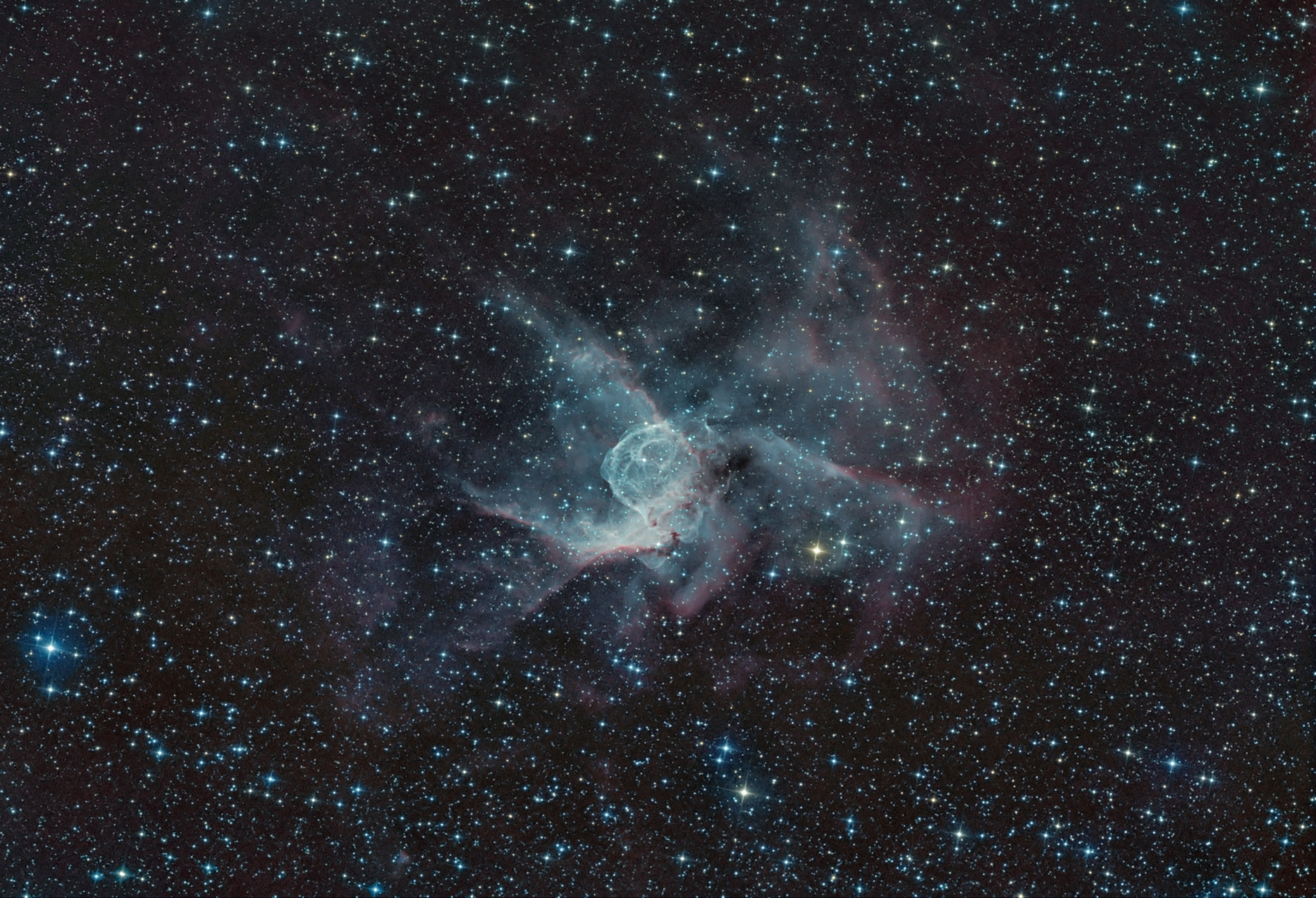 Dieser eindrucksvolle Nebel in der Form eines Wikingerhelms im Sternbild des Großen Hundes wird von dem hellen Stern in der Mitte des Nebels erzeugt, einem sogenannten Wolf-Rayet-Stern. Dies sind sehr massereiche und extrem heiße Sterne in der Endphase ihres Lebenszyklus, die große Mengen an Materie und Strahlung abgeben. Diese treffen dann auf interstellare Materie oder vorher vom Stern selbst abgegebenes Material und regen es zum Leuchten an.