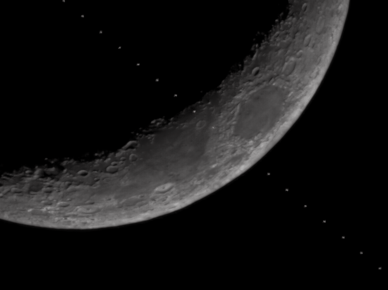 Tiangong (chinesische Raumstation) passiert die Mondsichel. Die Tiangong, die chinesische Raumstation, ist nur 15 Meter groß und damit siebenmal kleiner als die ISS, die Internationale Raumstation. Am 3. Januar 2025 um 18:35 Uhr zog sie vor der Mondsichel vorbei und ich konnte sie mit einem Film festhalten, den ich dann zu Fotos verarbeitete. Es flog mit etwa 28.000 km/h in 400 km Höhe vorbei und überquerte in 1 Sekunde den Mond. Skywatcher 150-750-Teleskop, Asi 224 mc-Kamera
