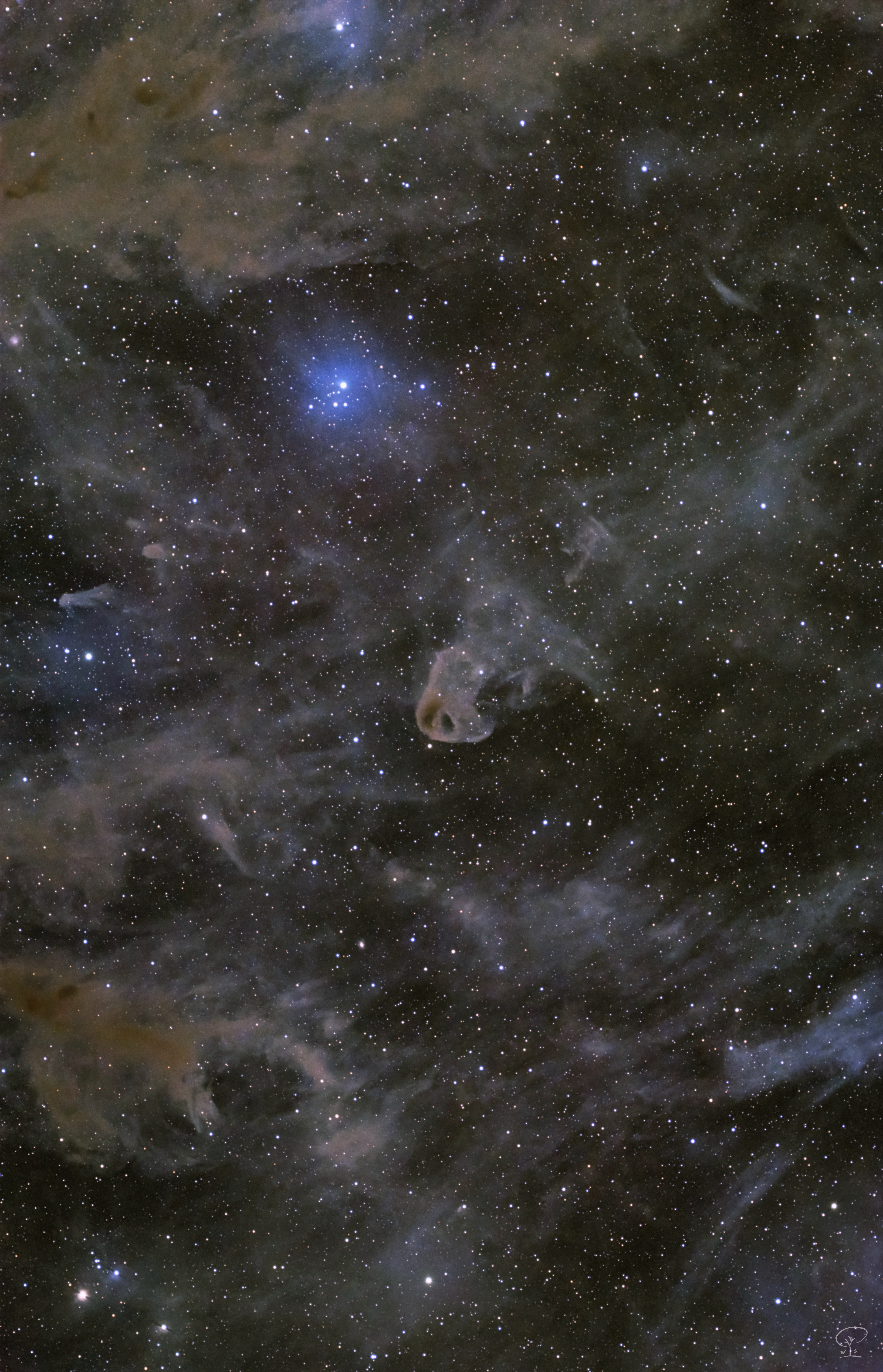 Im Zentrum der staubigen Nebulositäten ist LBN 777, ein Nebel, der wie ein kleiner Geier aussieht, wenn man das Bild drehen würde - aber ich will gerne Norden oben im Bild haben, daher verzeiht mir, dass ich das nicht mache. Am Hinterkopf des Geiers ist ein dunkler Fleck, das ist Banard 207, eine dichte Wolke, in der Sterne entstehen. Im Infrarotbereich würde man die jungen Protosterne sehen, hier eher weniger. An diesem Objekt habe ich mich schon vor zwei Jahren mit meinem kleinen Newtonteleskop versucht, habe dann aber aufgegeben, weil diese Nebel sehr lichtschwach sind und das Teleskop da auch nicht viel Licht in einer Nacht sammeln konnte. Diese Aufnahme hingegen ist simultan mit zwei f2-Systemen zwei Nächte hindurch belichtet worden, und da sieht alles gleich ganz anders aus. Aufnahmedatum: 8.11./9.11.2024