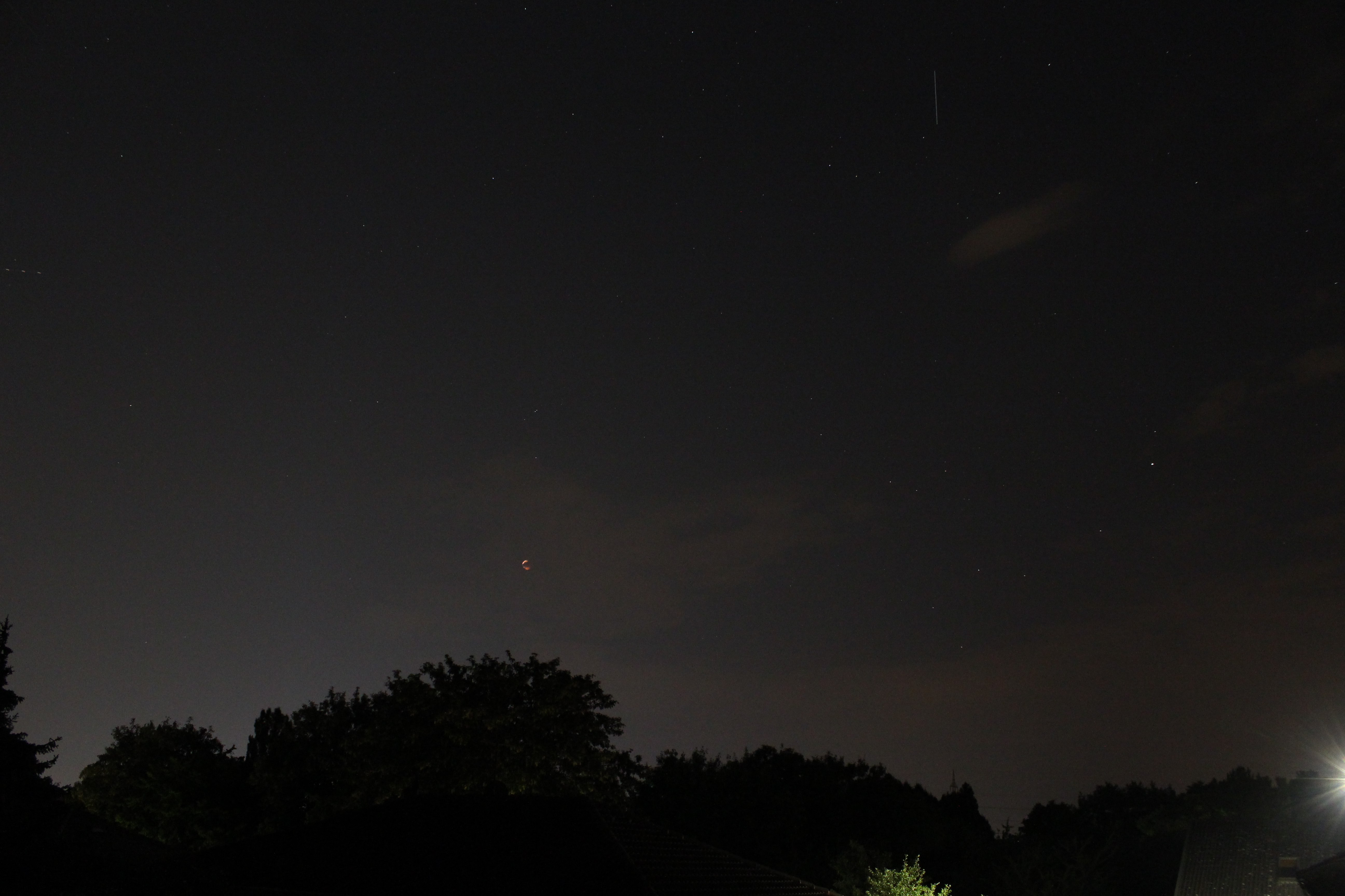 Sternfeldaufnahme des total verfinsterten Mondes. Leider waren Wolken im Weg. Trotzdem erkennt man oberhalb des "Blutmonds" Alpha und Beta Capricorni.