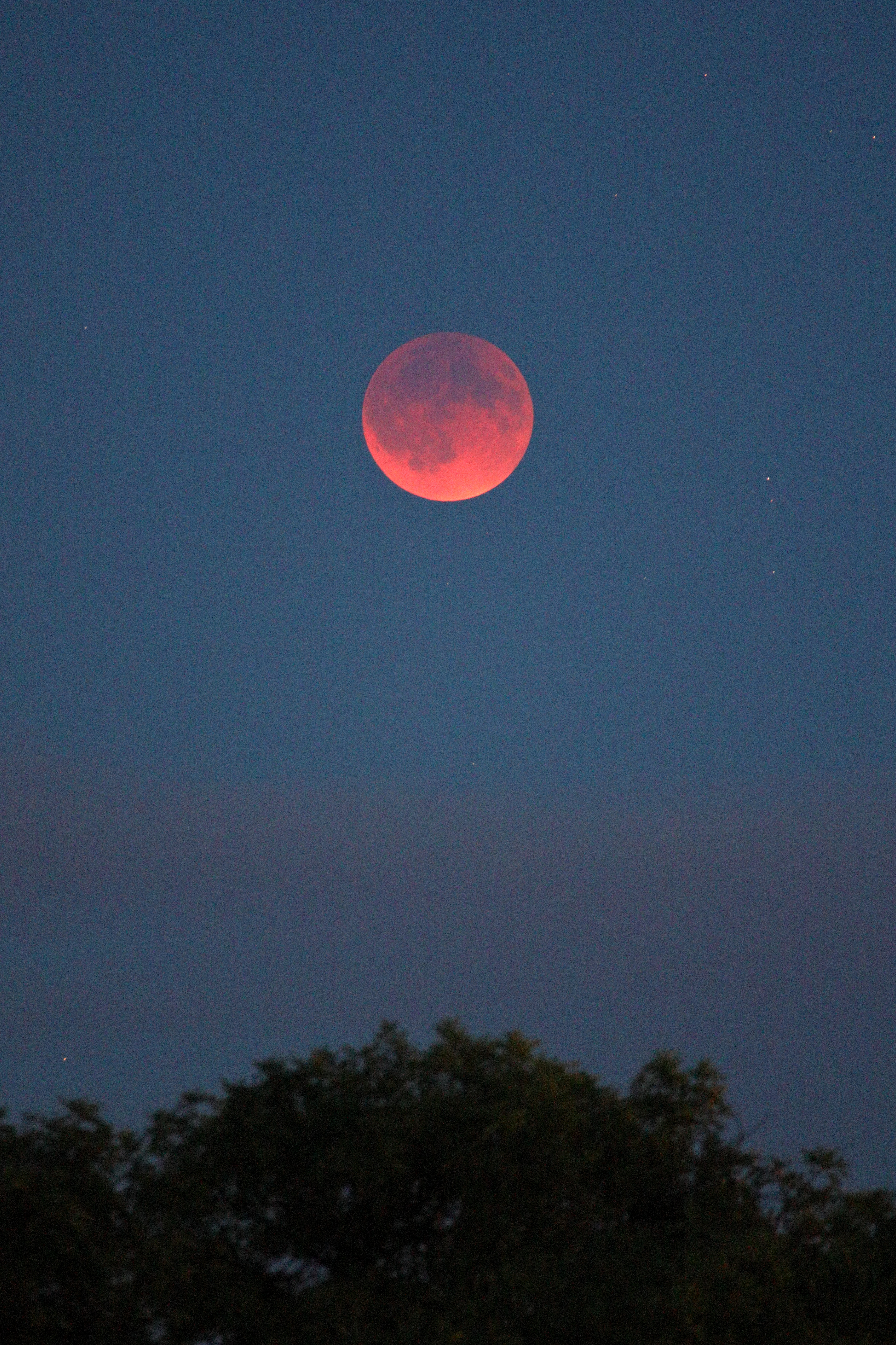 In Wien schaffte der total verfinsterte Mond es erst gegen 20:00 Uhr MESZ aus einer tiefliegenden Wolkenbank hervorzuschauen. Er war mit freiem Auge dann recht düster in der Dämmerung und ich beurteile auf der Danjon-Skala L=1-2 (Finsternismitte 20:12 MESZ: Mond 7,5° hoch, Sonne -9° tief) Bei zunehmender Dunkelheit und gegen Ende der Totalität um 20:40 MESZ sah er viel heller rötlich mit hellem Rand aus, da vergebe ich L=3.