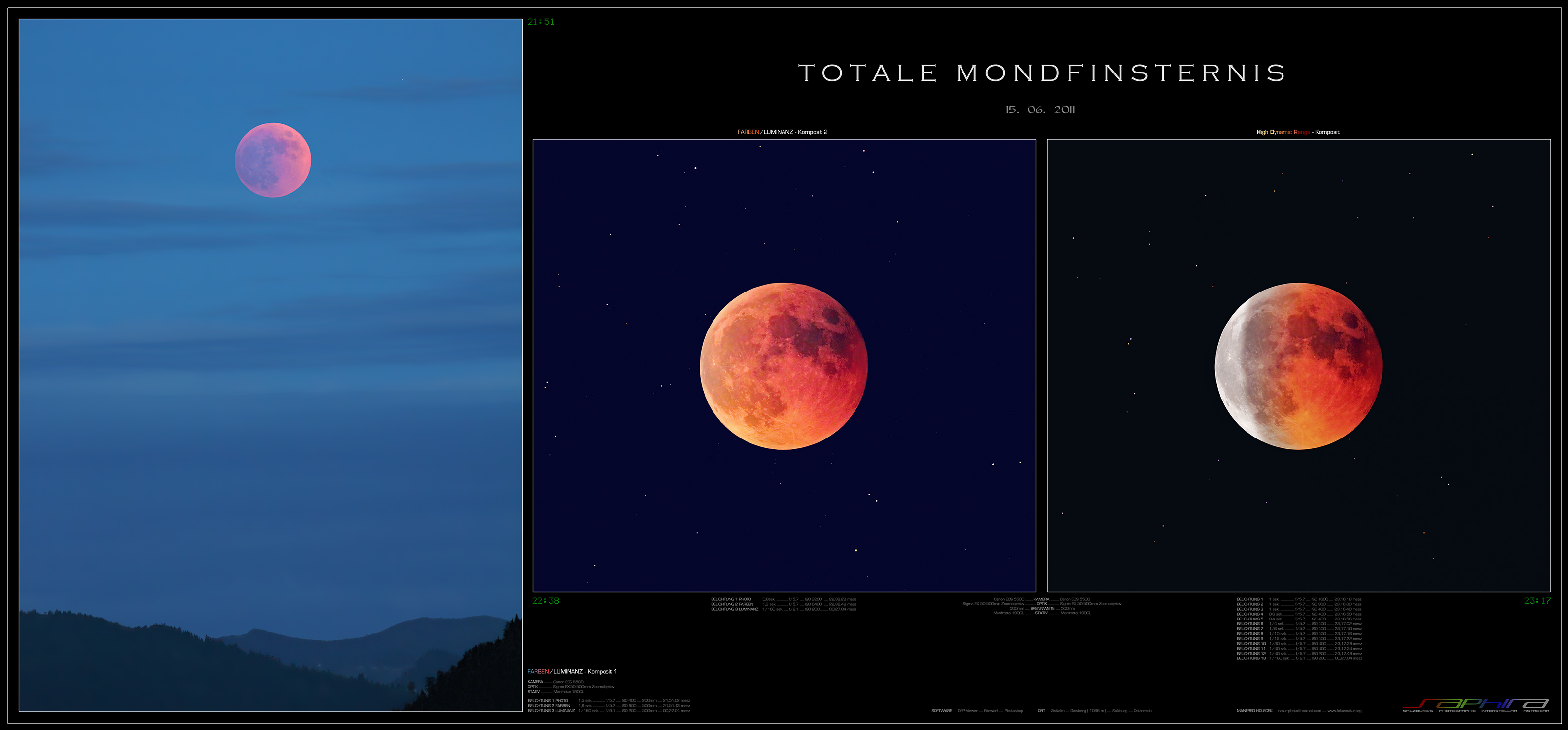 Anfänglich vereitelten horizontnahe Wolkenschichten mein eigentliches Ziel, den verdunkelten Mond während seines Aufganges über den Bergen zu fotografieren. Erst um 21:35 Uhr MESZ konnte ich den Mond visuell am noch hellen Himmel ausfindig machen. Die ersten zufriedenstellenden Aufnahmen dieses Abends gelangen mir dann eine gute viertel Stunde später, als der total verfinsterte Mond endlich in voller Pracht oberhalb der Wolken stand (Bild 1, links).