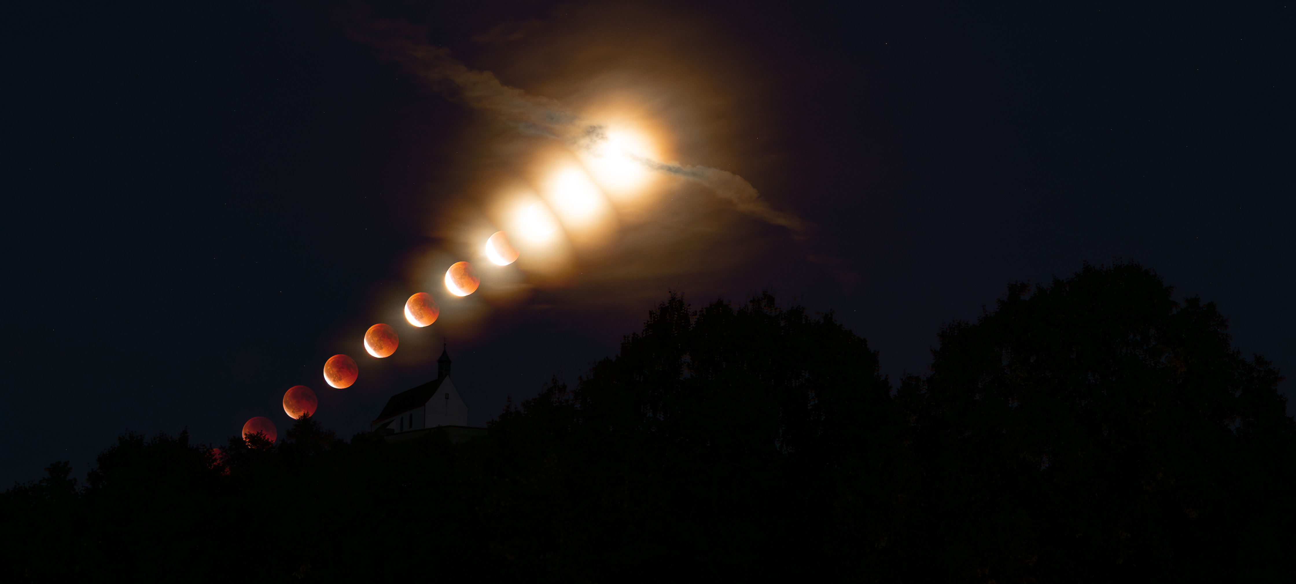 Bei dieser Mondfinsternis, bei der der Erdtrabant bereits verfinstert aufgehen würde, wollte ich die ersten Minuten nach Sichtbarwerden des roten Mondes unbedingt mit einem besonderen Vordergrund aufnehmen. Die Wahl fiel auf die in meiner Nachbarschaft befindliche Wurmlinger Kapelle – ein sehr bekanntes Bauwerk nahe Tübingen. Nach einiger Planungs- und Vorbereitungszeit rechtzeitig vor dem Tag der Finsternis, mit mehreren Testaufnahmen von verschiedenen Locations aus, entschied ich mich für insgesamt drei Aufnahmeorte, die mit Stativen und Kameras bestückt wurden. Da der eine Standpunkt etwas weiter von den beiden anderen entfernt lag, plante ich bereits im Vorfeld mit vorprogrammierten Timelapse-Sequenzen. Auf diese Weise entstanden viele verschiedene Perspektiven mit mehreren Kameras und Objektiven. Als Ergebnis erhielt ich eine große Menge von Fotos, mit den jeweils zugehörigen Timelapse-Videos. Glücklicherweise spielte das Wetter vorzüglich mit – inklusive einiger fotogener Zirruswolken… Für mich hat sich der Aufwand gelohnt. Es war – auch live mit bloßem Auge – ein ganz besonderes Erlebnis.