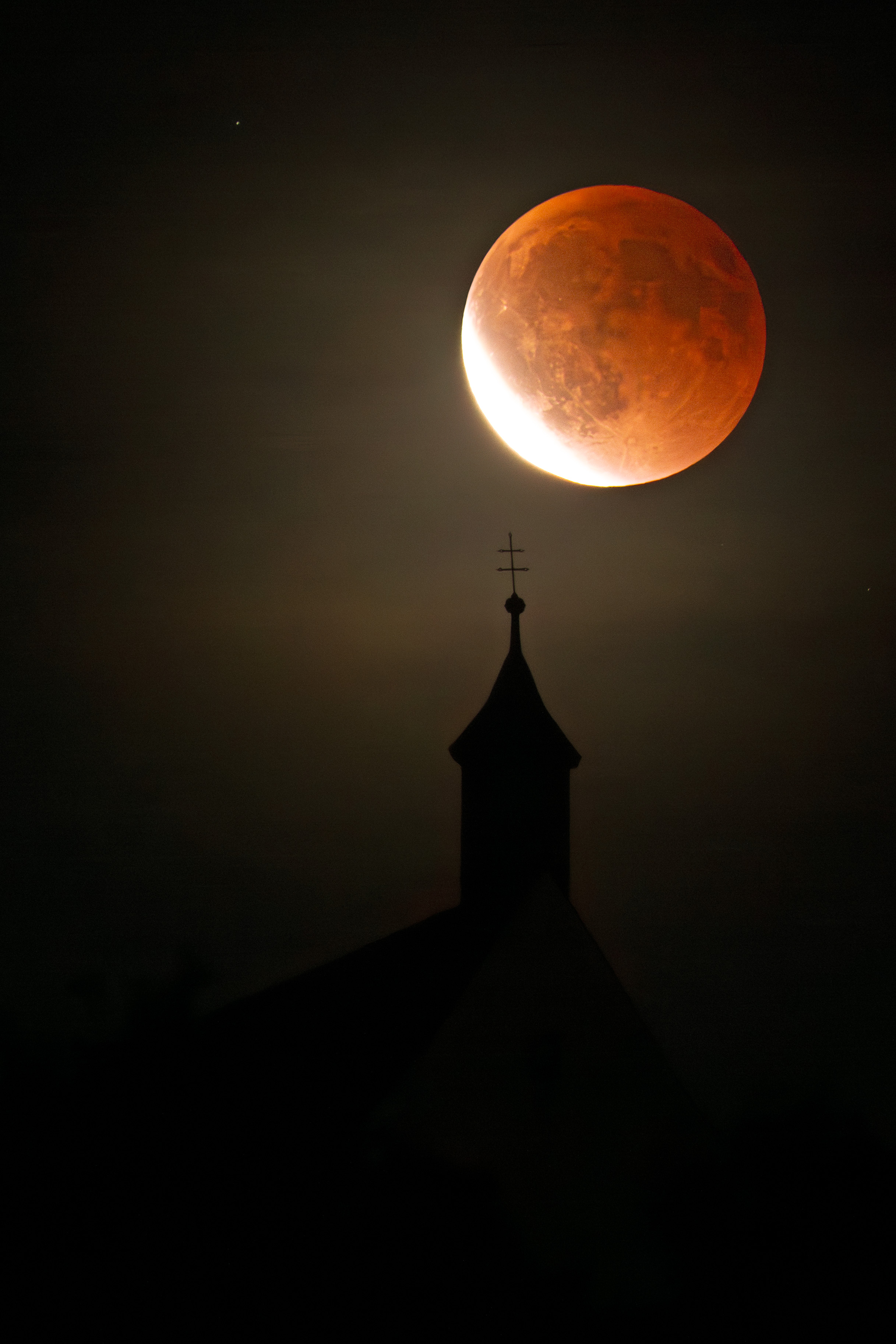 Bei dieser Mondfinsternis, bei der der Erdtrabant bereits verfinstert aufgehen würde, wollte ich die ersten Minuten nach Sichtbarwerden des roten Mondes unbedingt mit einem besonderen Vordergrund aufnehmen. Die Wahl fiel auf die in meiner Nachbarschaft befindliche Wurmlinger Kapelle – ein sehr bekanntes Bauwerk nahe Tübingen. Nach einiger Planungs- und Vorbereitungszeit rechtzeitig vor dem Tag der Finsternis, mit mehreren Testaufnahmen von verschiedenen Locations aus, entschied ich mich für insgesamt drei Aufnahmeorte, die mit Stativen und Kameras bestückt wurden. Da der eine Standpunkt etwas weiter von den beiden anderen entfernt lag, plante ich bereits im Vorfeld mit vorprogrammierten Timelapse-Sequenzen. Auf diese Weise entstanden viele verschiedene Perspektiven mit mehreren Kameras und Objektiven. Als Ergebnis erhielt ich eine große Menge von Fotos, mit den jeweils zugehörigen Timelapse-Videos. Glücklicherweise spielte das Wetter vorzüglich mit – inklusive einiger fotogener Zirruswolken… Für mich hat sich der Aufwand gelohnt. Es war – auch live mit bloßem Auge – ein ganz besonderes Erlebnis.