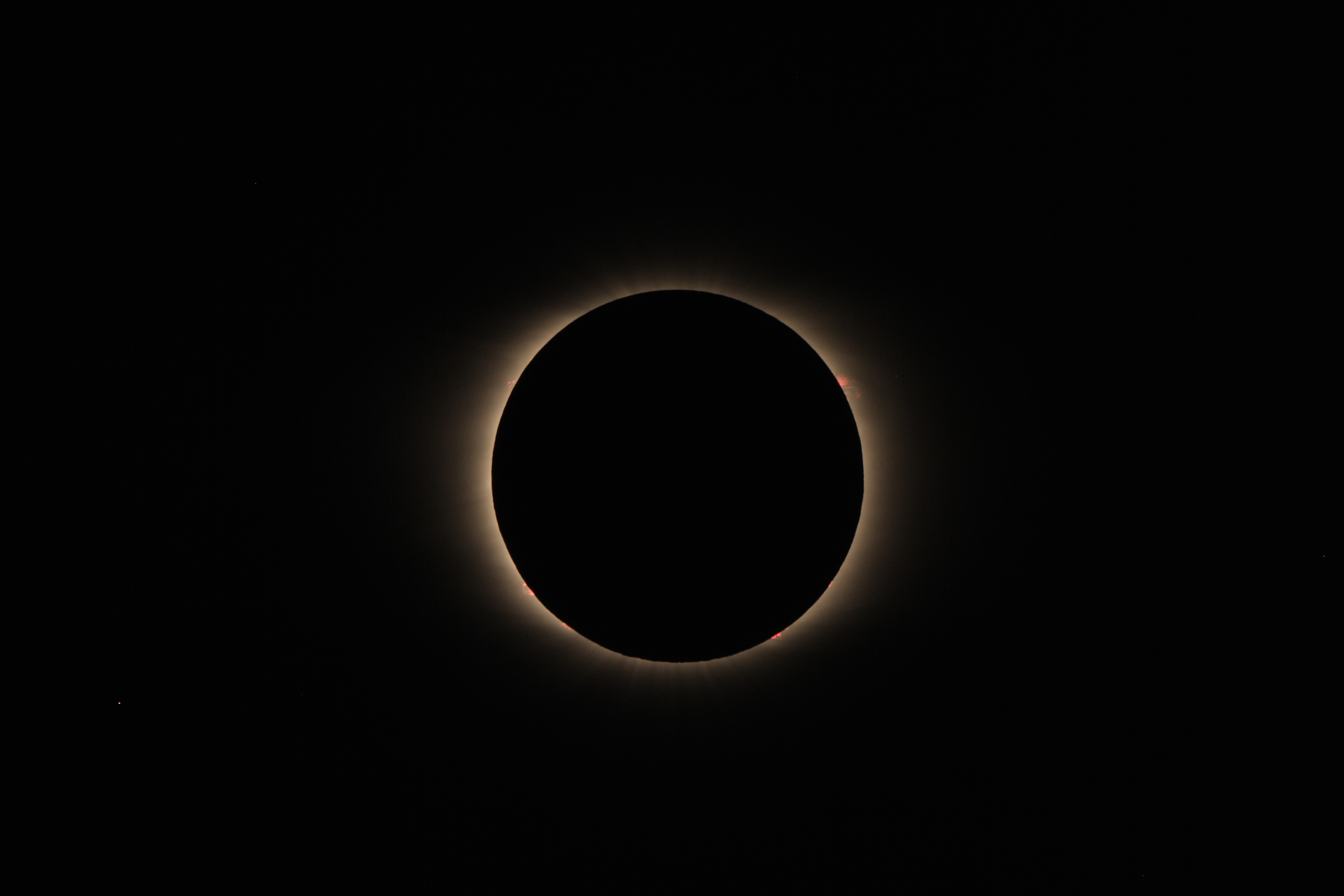 Aufnahme der totalen Sonnenfinsternis, ca. 34 s nach Beginn der Totalität, Komposit aus drei gleich belichteten Aufnahmen. Trotz des perfekten Wetters und des hoch gelegenen Standorts war das Seeing recht unruhig. Im 2x-Bino und mit dem bloßem Auge bot sich ein ungewöhnlich stark flackernder Diamantring zu Beginn und Ende der Totalität.
