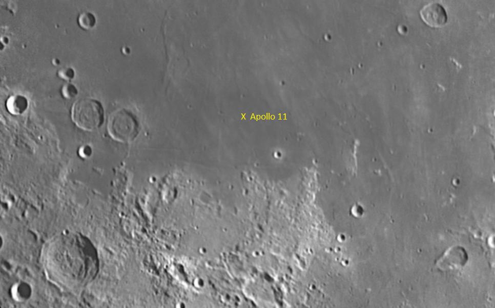 Die Aufnahme des durch ein X gekennzeichneten Landegebiets von Apollo 11 erfolgte am 9. Juli 2019. Der Mond war zu diesem Zeitpunkt etwa 374000 Kilometer von der Erde entfernt. Das Bild setzt sich aus sechs Teilaufnahmen zusammen. Es wurden jeweils 10000 Bilder mit 13,02 ms je Bild mit 76 Bildern pro Sekunde belichtet, mit IR-Passfilter. Die Verwendungsrate betrug vier Prozent bei umgerechnet F20.