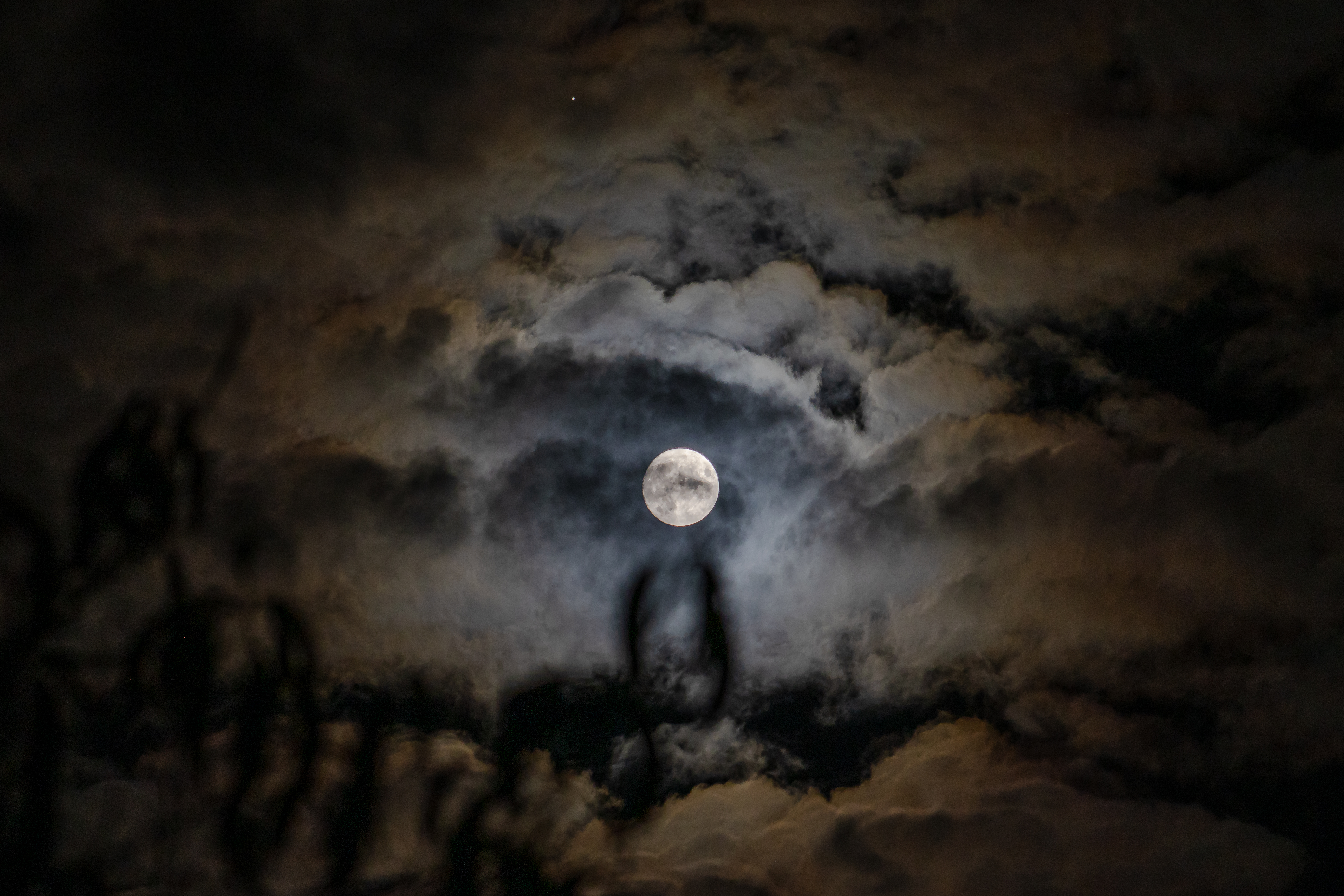 Konjunktion von Jupiter und Mond. Die Wolken dienten als Filter für den Mond.