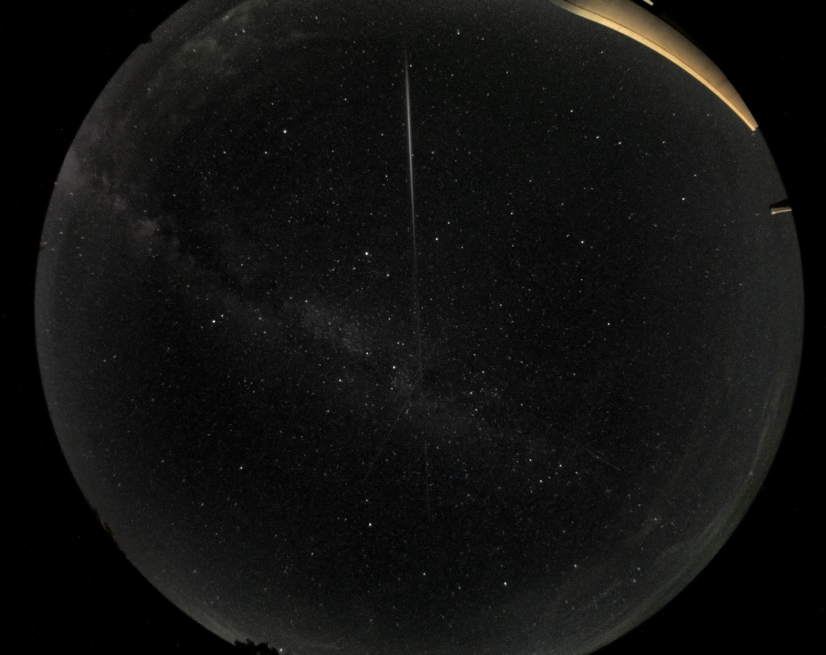 Am Abend des 25. August tauchte eine chinesische Rakete vom Typ Chang Zheng 8A am Himmel über Würzburg auf und ließ Treibstoff ab. Das Bild zeigt die Spur während der 41 Sekunden dauernden Aufnahme mit einer ungekühlten Allsky-Kamera. Norden ist rechts, Westen ist oben. Der helle Stern etwas oberhalb von Milchstrasse und Bildmitte ist Vega im Sternbild Leier. Die Milchstraße steht steil über dem Südhorizont auf der linken Seite des Bildes.