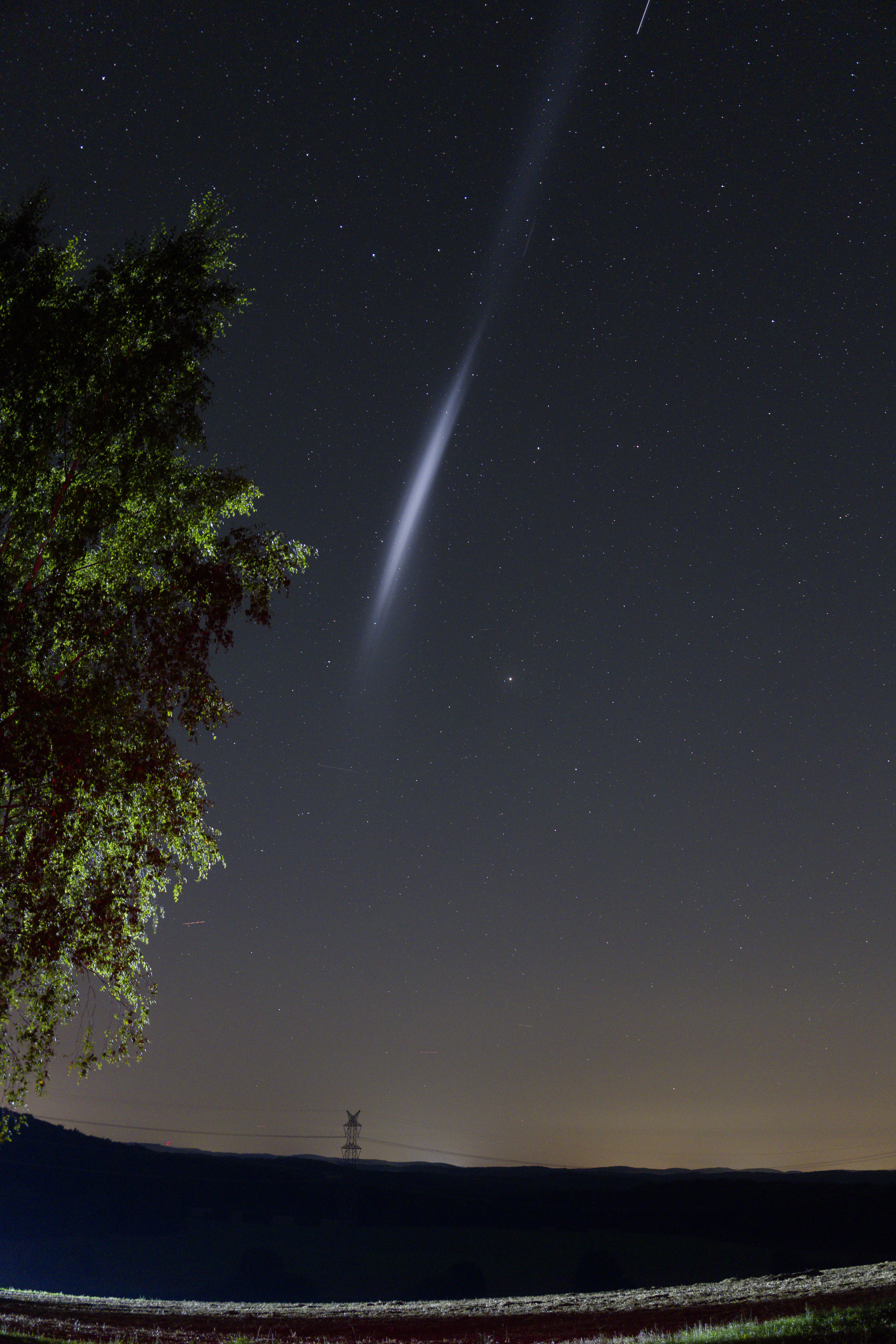 Eine chinesische »Lange Marsch«-Rakete stieß am Abend des 25. August Treibstoff aus, nachdem die Satelliten-Nutzlast ausgesetzt wurde. Es erschien eine lange Leuchtspur, die zuerst an einen Scheinwerferstrahl erinnerte. Die Spur zog jedoch innerhalb von rund 15 Minuten vom westlichen Abendhimmel durch den Zenit und verschwand dann im Osten (vermutlich im Schatten der Erde). In diesem ersten Bild der Sequenz sind rechts oben auch zwei Strichspuren zu erkennen mit der gleichen Flugrichtung, jedoch leicht parallel verschoben. Es könnte sich um die Raketenstufe selbst und einen ausgesetzten Satelliten handeln.