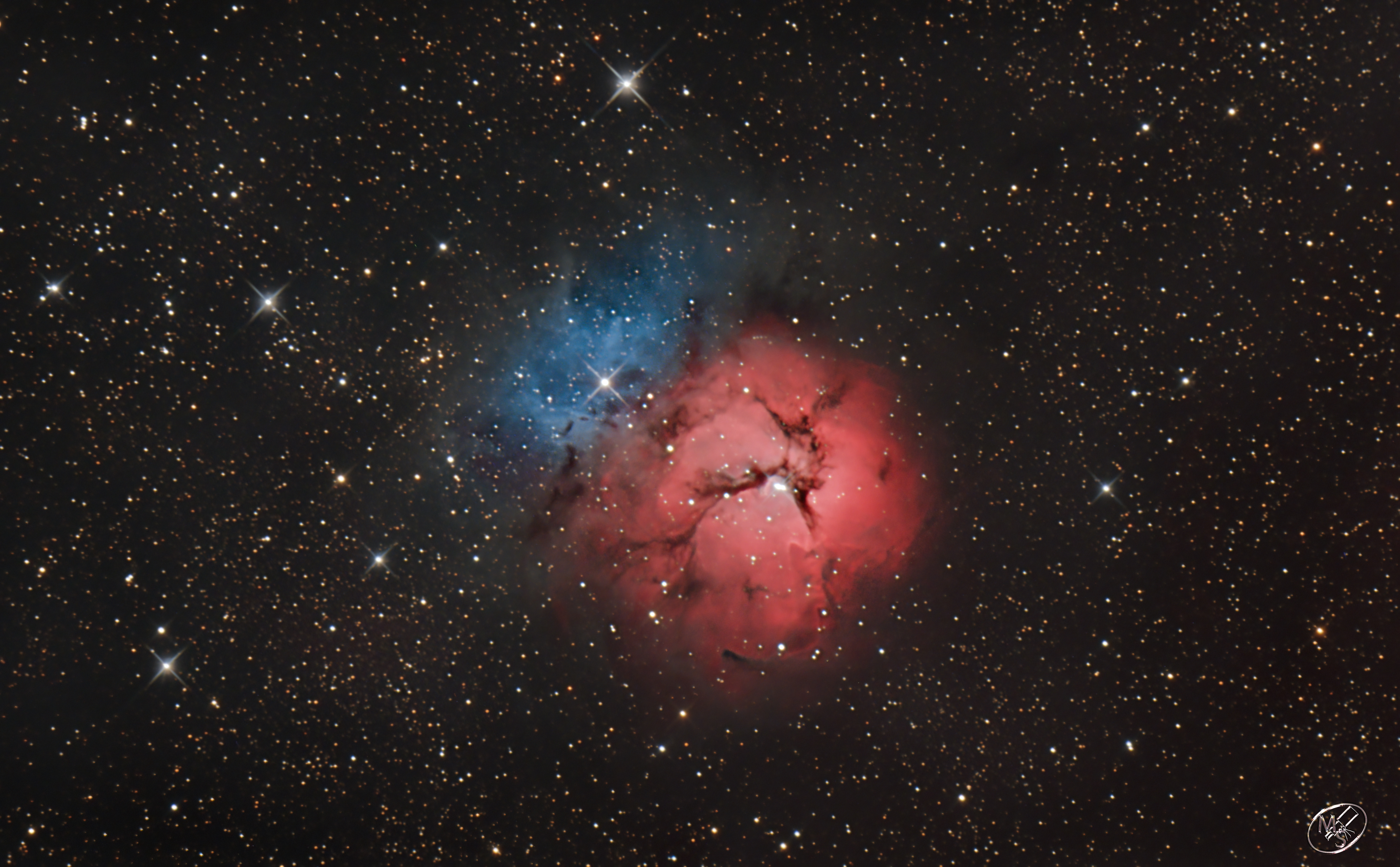 Hier haben sich die kurzen schlaflosen Nächte gelohnt, auch wenn der Trifidnebel in Mitteleuropa eher schlecht zu sehen ist. Die Kombination aus Emissions- und Reflexionsnebel bildet dabei einen schönen farblichen Kontrast. Die Dunkelwolken runden das Motiv ab.