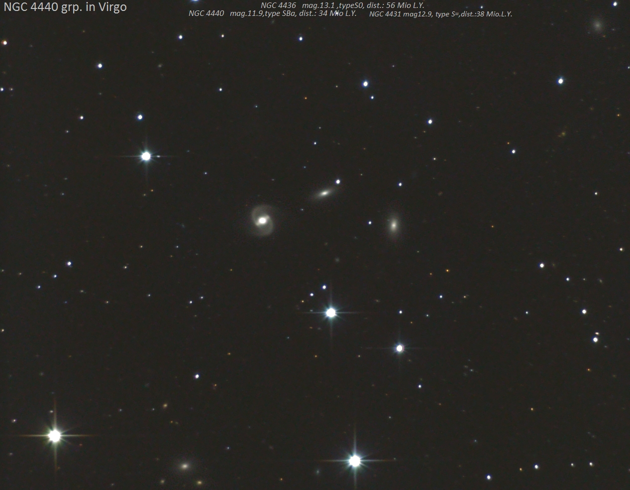 Dieses interessante Trio NGC 4440 (östlich), eine schöne SB-a-Balkenspirale und die zwei SO-Galaxien (Hubble´s lenticular galaxies) gehören zum Virgo-Galaxienhaufen.