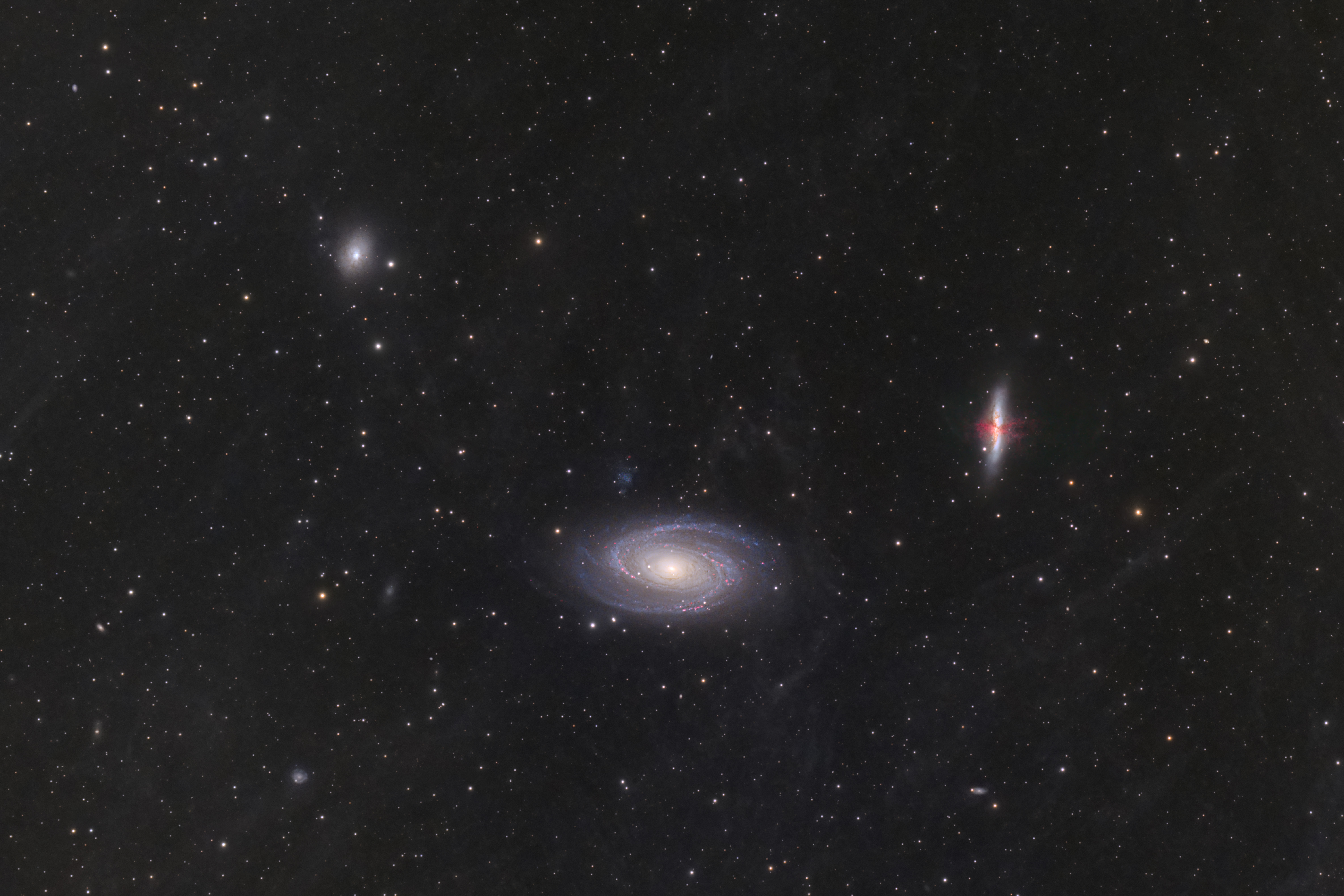 Bodes Galaxie (M 81), die Zigarrengalaxie (M 82) und Garlands Galaxie (NGC 3077) umgeben vom galaktischen Zirrus. Die ausgedehnte Schönwetterphase Ende März bot die Gelegenheit für sehr lange Belichtungen. So kamen für dieses Bild elf Stunden RGB und elf Stunden H-Alpha zusammen.