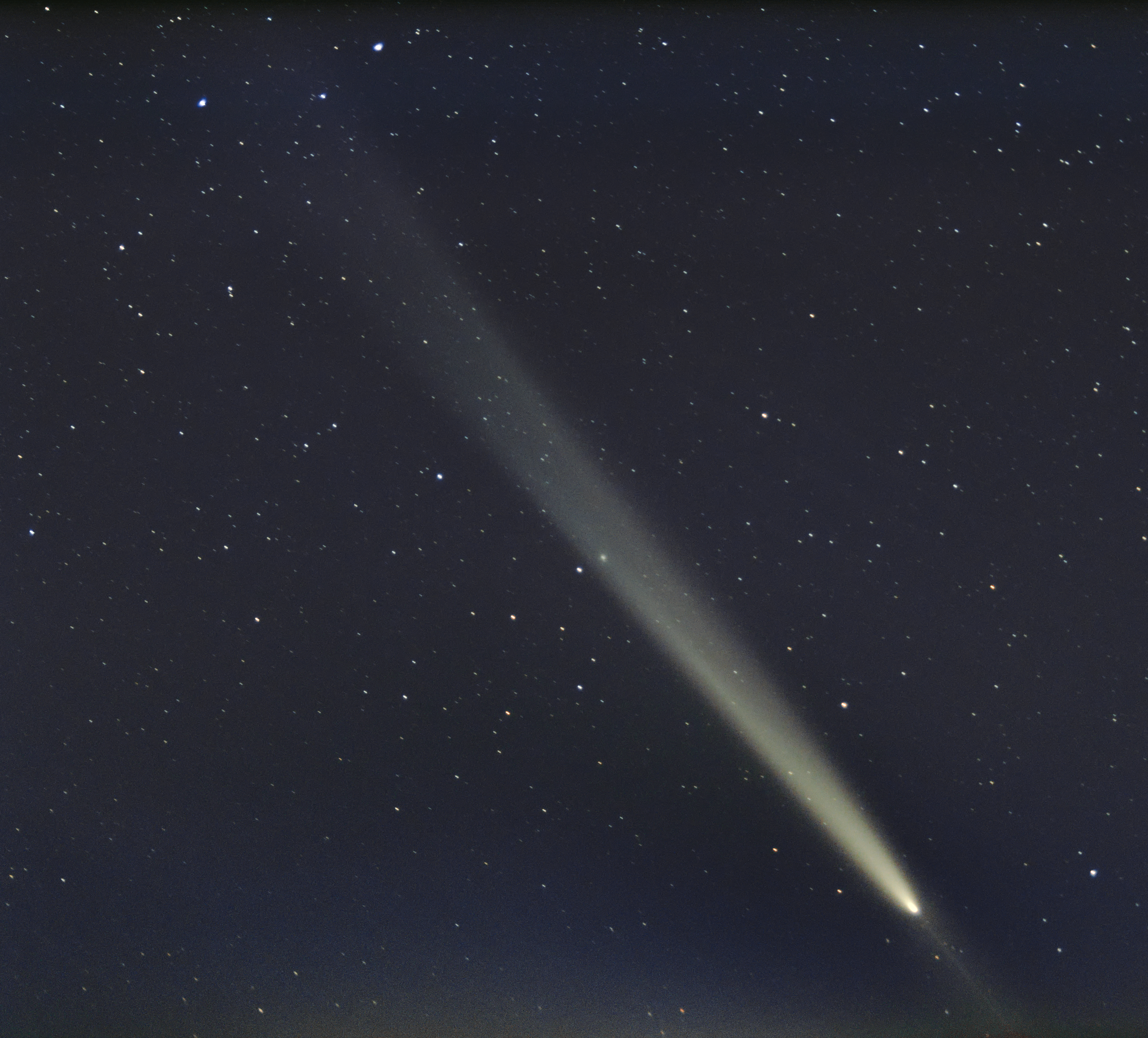 Ich hatte am 14. Oktober das Glück, ohne Wolken den Kometen des Jahres zu fotografieren. Der Komet war aber auch Visuell gut erkennbar. Der ganze, auf dem Bild sichtbare Schweif ist etwa 15 Grad lang. Interessanterweise sieht man ab dem Kometenkopf einen zweiten Schweif in entgegengesetzter Richtung. Das ist der Gegenschweif, das Ende des gekrümmten Schweifs. Trotz des hellen Mondes und der Dämmerung, kann man mitten im Schweif den Kugelsternhaufen M5 auffällig sehen. Weiter unten ist (nur mit gutem Willen, wenn man die Position kennt) Komet 13P/Olbers aufgenommen.