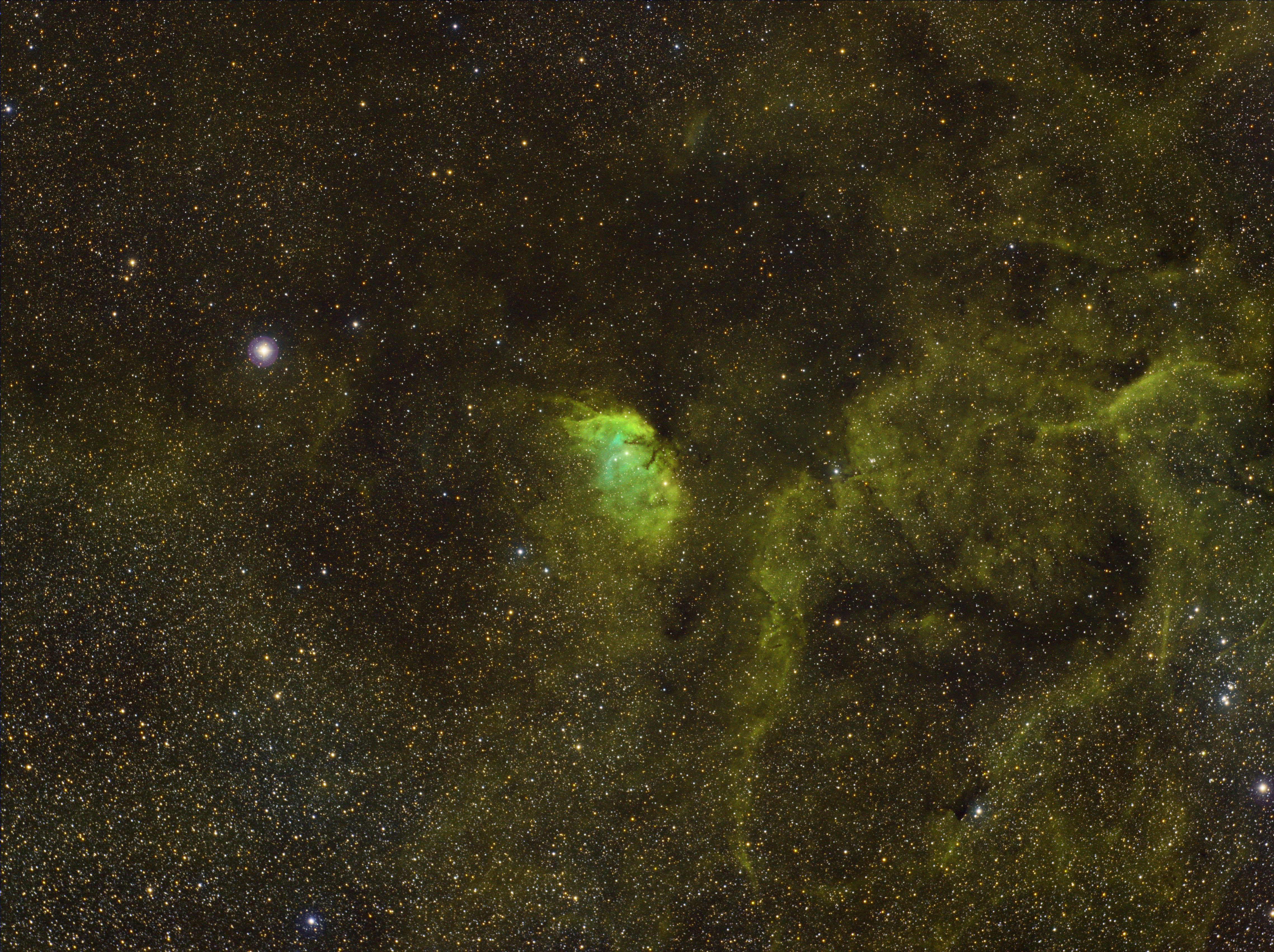 Der Tulpennebel im Schmalband in der Hubble Palette in SHO. Man erkennt die Schockwelle vor dem Stern im Tulpennebel und den Doppelstern mit dem Schwarzen Loch Cygnus-X1.