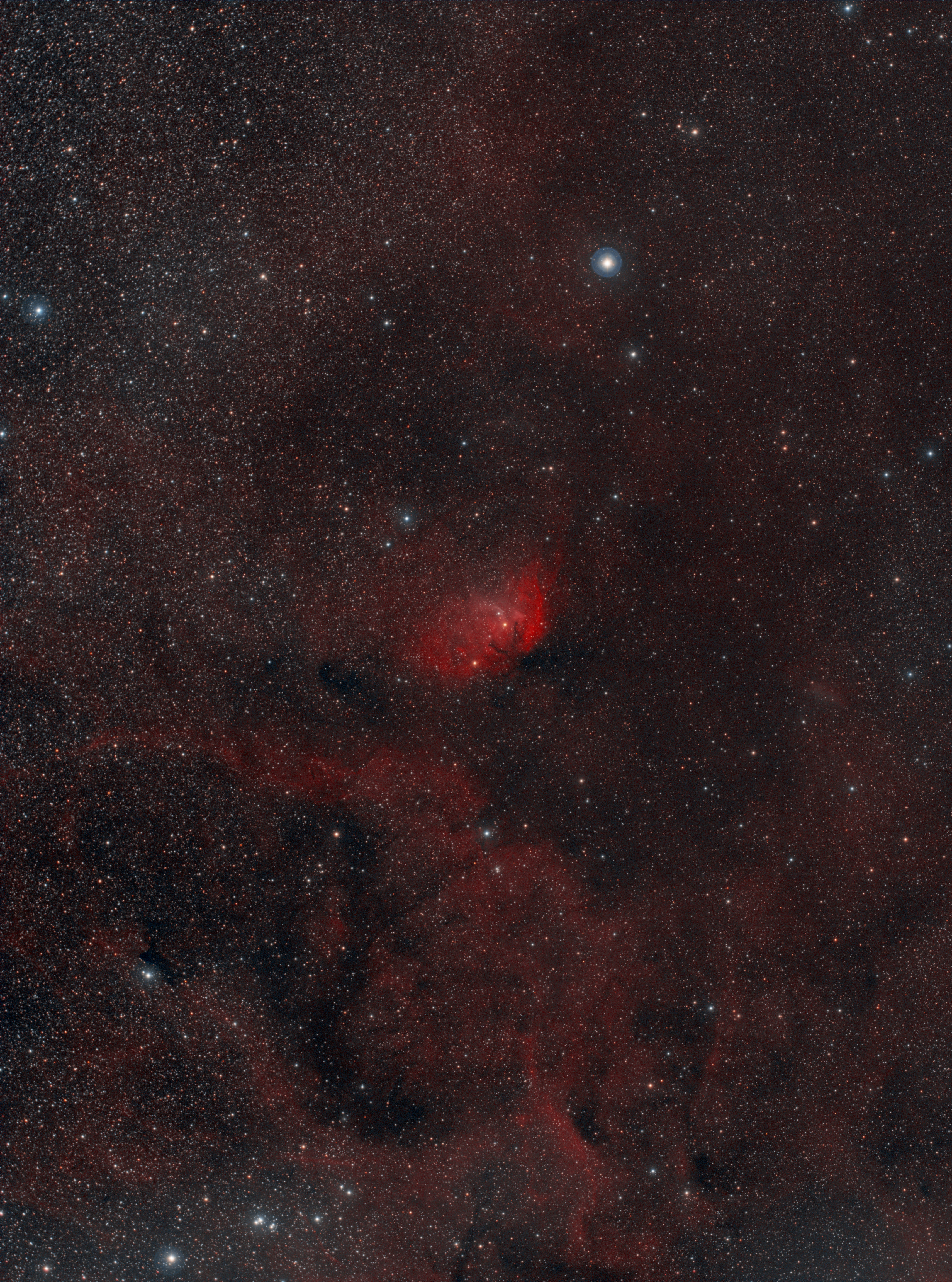 Der Tulpennebel im Schmalband in der Hubble Palette in SOO. Man erkennt die Schockwelle vor dem Stern im Tulpennebel und den Doppelstern mit dem Schwarzen Loch Cygnus-X1.