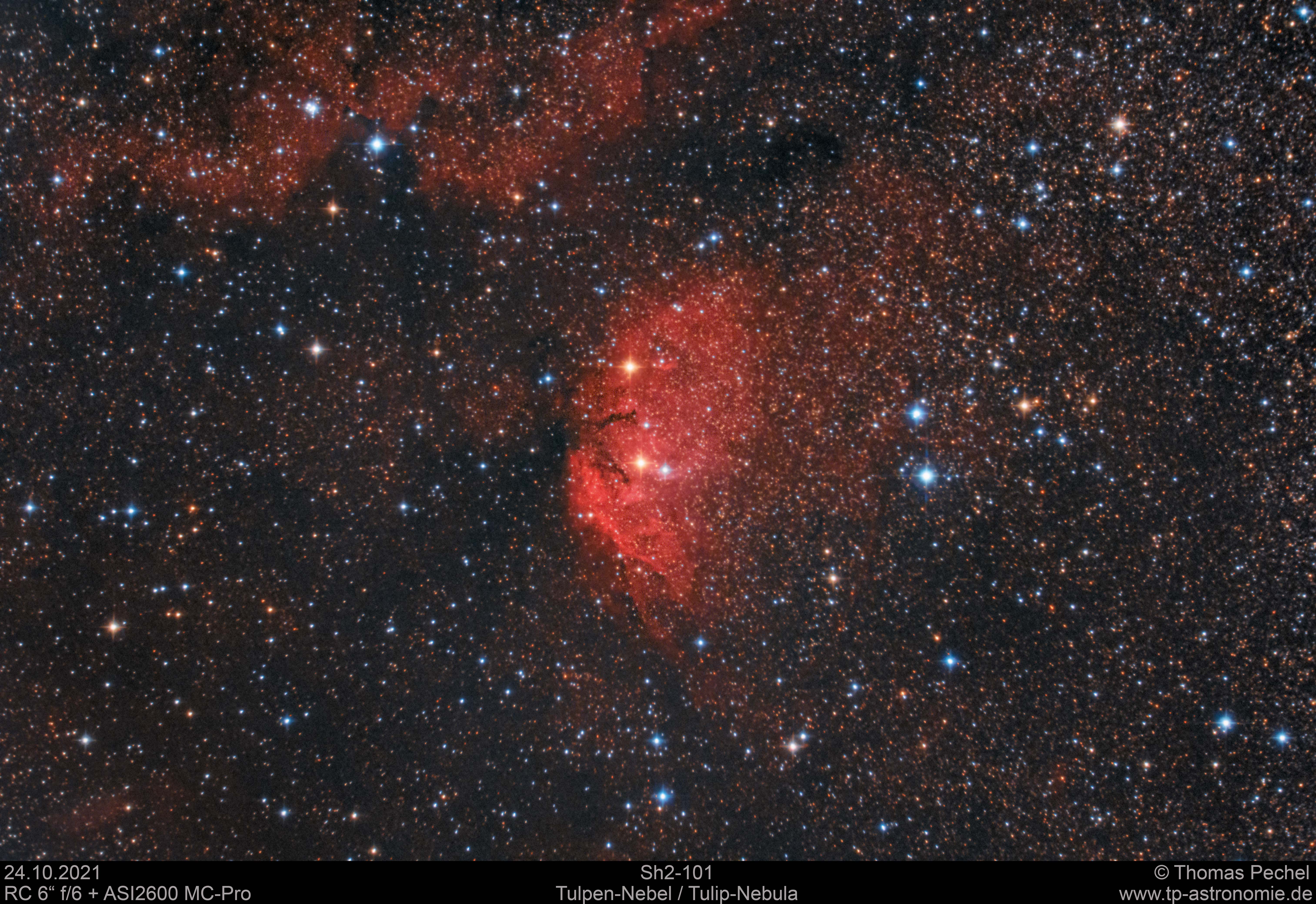 Im Schwan findet man diese 6000 Lichtjahre entfernte HII-Region, die im Katalog von Stewart Sharpless unter der Bezeichnung Sh2-101 zu finden ist. Dieser Nebel gleicht einer Tulpenform, und bekam daher diesen Namen. Unter den Koordinaten RA = 19 h 59 min 55 s, DE = +35° 16' 36" lässt sich der Nebel leicht anfahren.