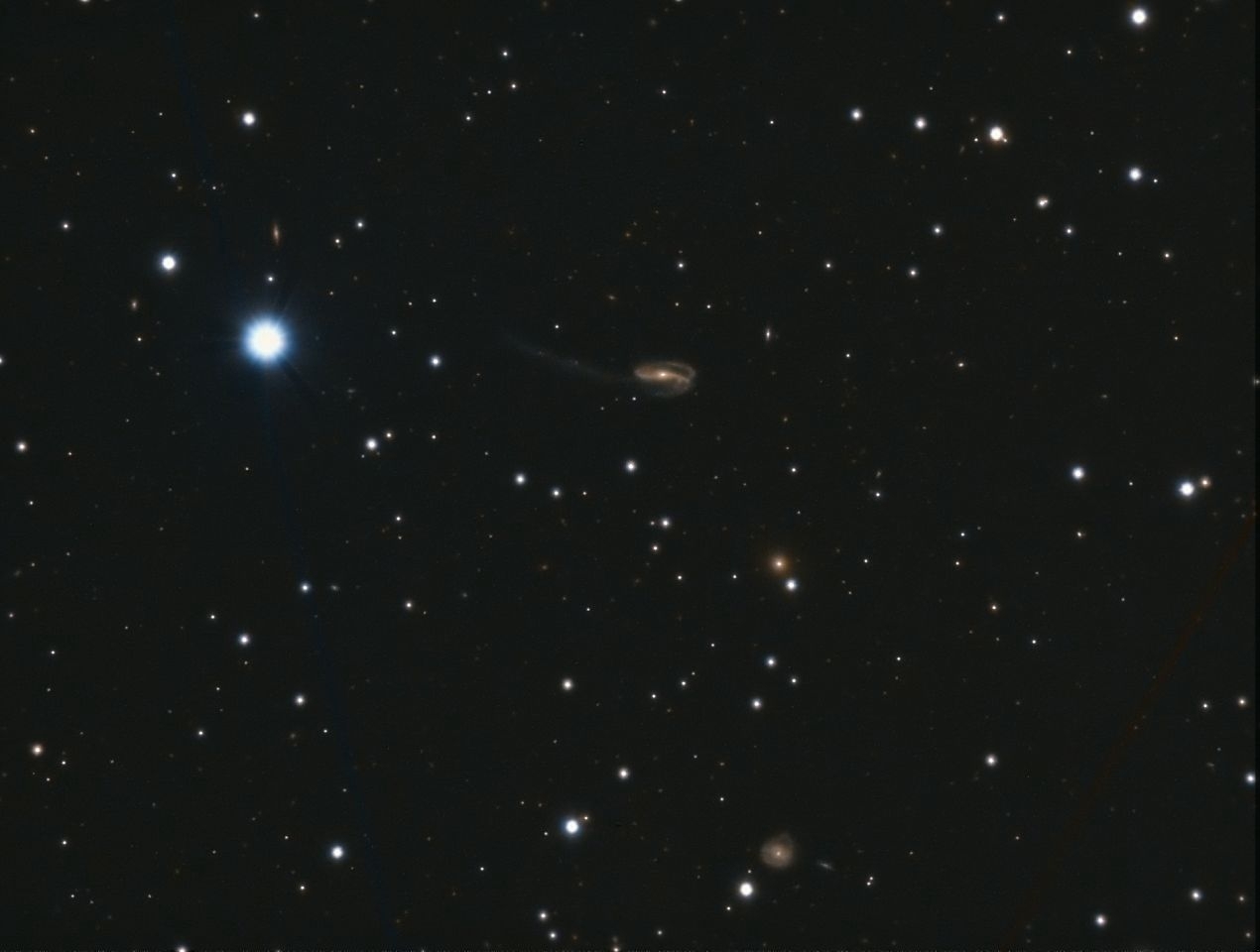 Eine kollidierende Galaxie mit dem Namen »Tadpole« (Katalogname UGC 10214) befindet sich inmitten einer reichen Gegend an Galaxien. Die Kaulquappe mit ihrem langen Sternenschweif sieht aus wie ein durchgedrehtes Feuerwerk, ganz anders als die Bilder aus den Lehrbüchern von stattlichen Spiralgalaxien. Ihre verzerrte Form wurde durch einen kleinen Eindringling verursacht, einer kompakten Galaxie, die in der Nähe der massereicheren Tadpole zu sehen ist. Die Kaulquappe befindet sich in etwa 420 Millionen Lichtjahren Entfernung im Sternbild Drache (Draco). Die starken Gravitationskräfte, die durch die Interaktion entstanden sind, haben den langen Trümmerschweif aus Sternen und Gas entstehen lassen, der sich über mehr als 280000 Lichtjahre erstreckt.
