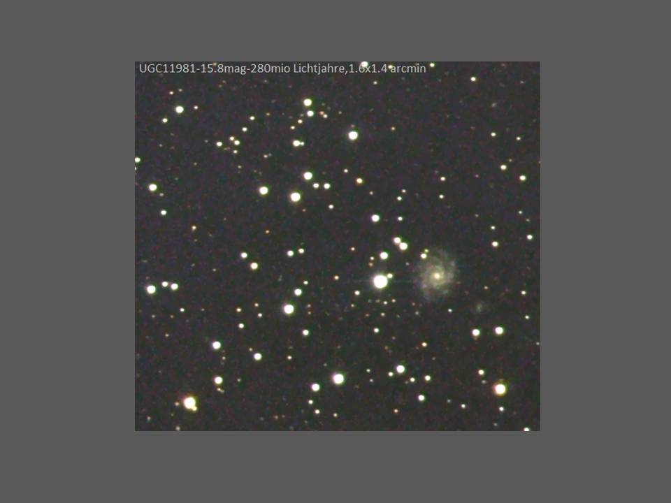 Man findet eine Face-on Spirale (15,8 mag, Type Sb-c in einer Entfernung von 280 Millionen nicht allzu oft am Himmel! Sie wirkte so zerbrechlich und so weit entfernt, dass ich zu philosophieren begann. Nehmen wir an, es gäbe dort draußen irgendwo eine intelligente Zivilisation, die wie wir ins Universum hinausspäht.Wie würde ihnen unsere Michstrasse erscheinen? UGC 11981 ist eine Face-on-Spirale, also sieht man unsere Milchstrasse irgendwo in der Nähe einer ihrer galaktischen Pole. Außerdem befindet sich UGC 11981 23 Grad südlich des galaktischen Äquators, also müsste unsere Michstraße diese Neigung relativ zu UGC 11981 aufweisen. Ich begann nun, eine geeignete Galaxie mit ähnlicher Neigung und Größe am Himmel zu suchen und fand auch eine geeignete.