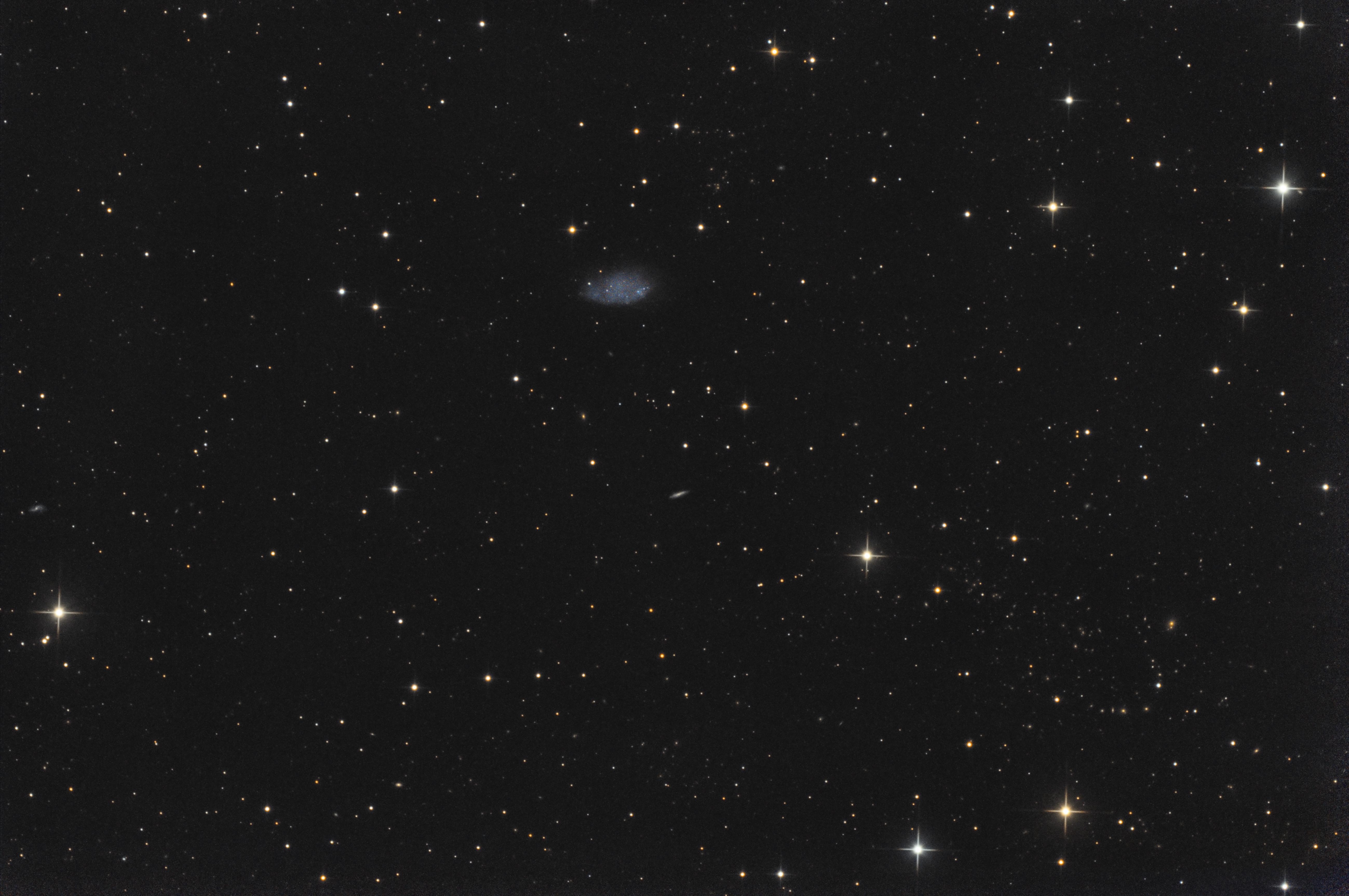 Die ganz nahen und die ganz weit entfernten Deep-Sky-Objekte sind hier auf einem Bild vereint. UGC 8201 gehört zu den wenig fotografierten Dwarfs (Zwerggalaxien) aus dem Dunstkreis der M81-Gruppe. Das ist also in unserer intergalaktischen Nachbarschaft. Das ist so nah, dass man in dem Zwerg auch die zahlreichen Kugelsternhaufen gut erkennen kann. Rechts unten im Bild finden sich zahlreiche Mitglieder des Galaxienhaufens Abell 1678. Dieser Haufen mit einer Rotverschiebung von z = 0,1066 ist etwa 500 Millionen Lichtjahre entfernt.
