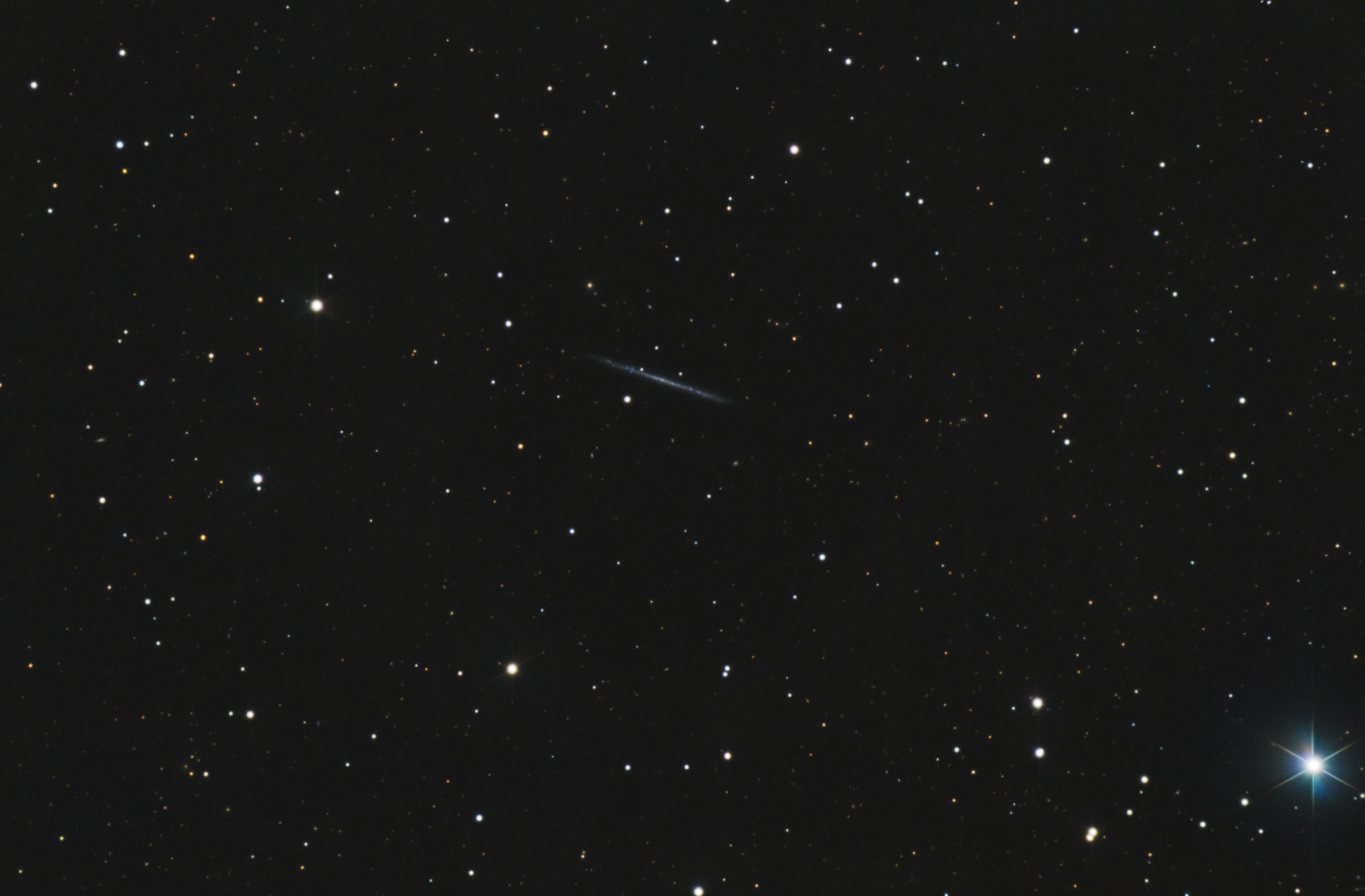 Bei einer Aufnahmebrennweite von 1750 mm wirkt die superdünne Galaxie nicht mehr so verloren im Sternenmeer. Die edge-on Galaxie UGC 9242 ist etwa 85 Millionen Lichtjahre entfernt, nur 13,5 mag hell und die sechs Bogenminuten Durchmesser ergeben einen wahren von 150000 Lichtjahren. Sie zeigt keinen ausgeprägten Kern und kein deutliches Staubband, dafür aber zahlreiche helle blaue Sternhaufen.