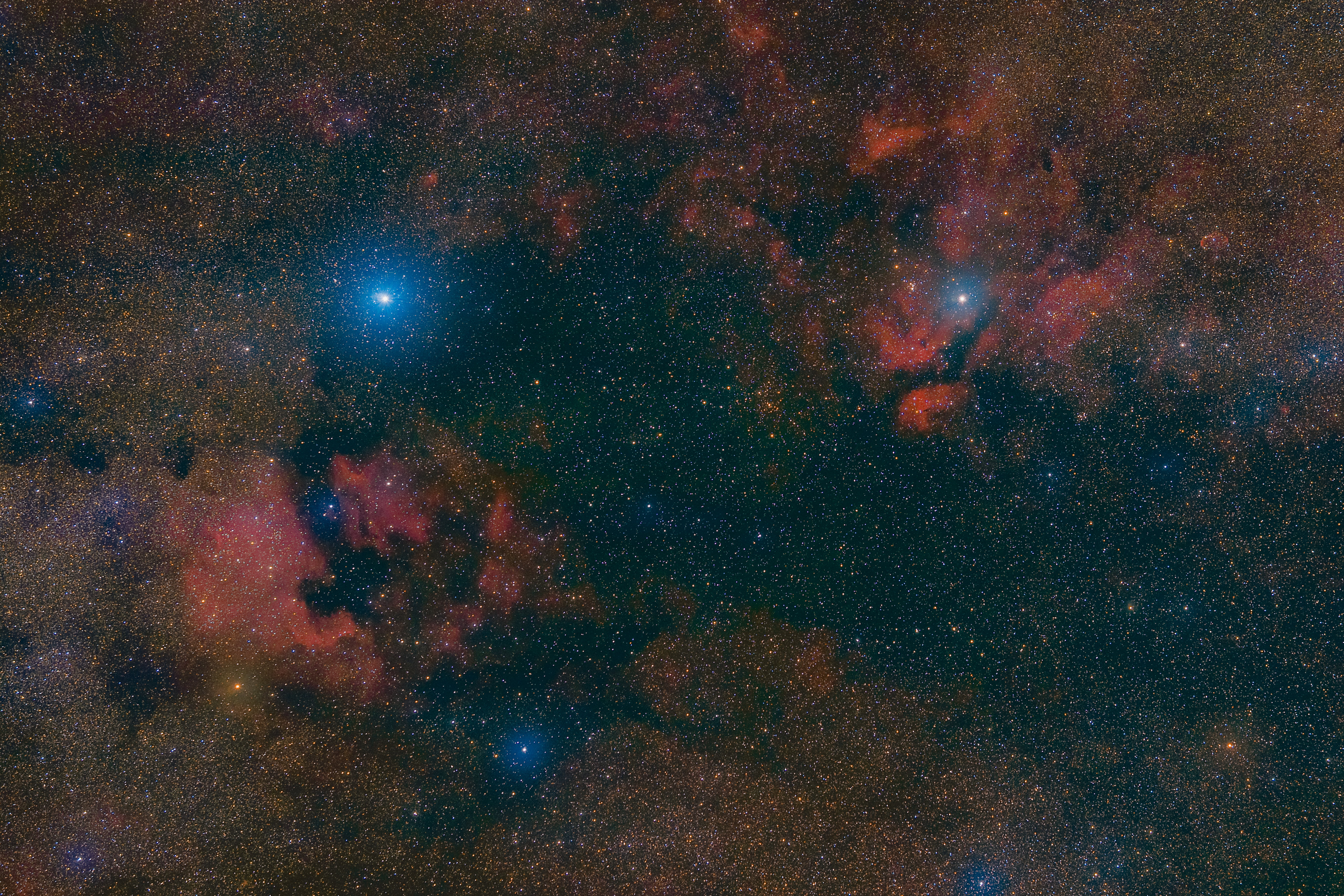 Bei sehr klarem Himmel konnte ich direkt von meinem Mannheimer Balkon aus die roten Gasnebel in der Umgebung des markant hellen blauen Sterns Deneb fotografieren. Dazu habe ich eine für Astronomie modifizierte Kamera benutzt. Am Objektiv meiner Kamera hatte ich zwei Filter gleichzeitig montiert: Einen Filter zur Unterdrückung der Lichtverschmutzung und einen Diffusor zur Hervorhebung der hellen Sterne und deren Farben.