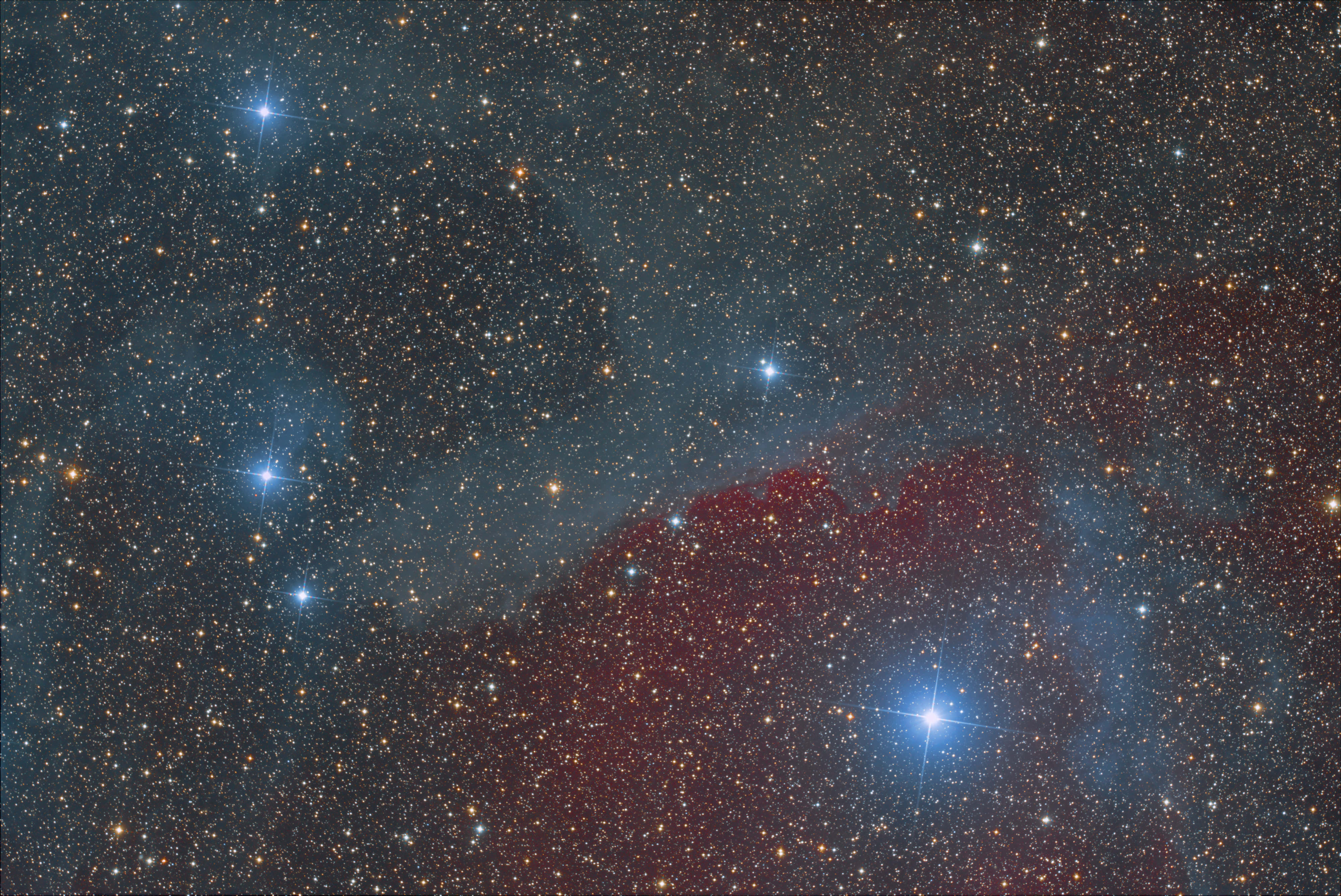 Blaue Reflexionsnebel und rote Wasserstoffwolken zieren die Umgebung von Pi Scorpii.
