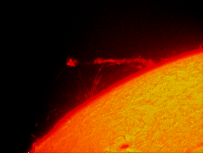 So macht Sonne Spass ! Diese schönen "Spritzer" kombiniert mit der großen und langen Protuberanz zeigt doch eine tolle Vielfalt, mit der unsere Sonne uns erfreuen kann. So sah es durch das Teleskop aus - ich habe das Bild also nicht gedreht...