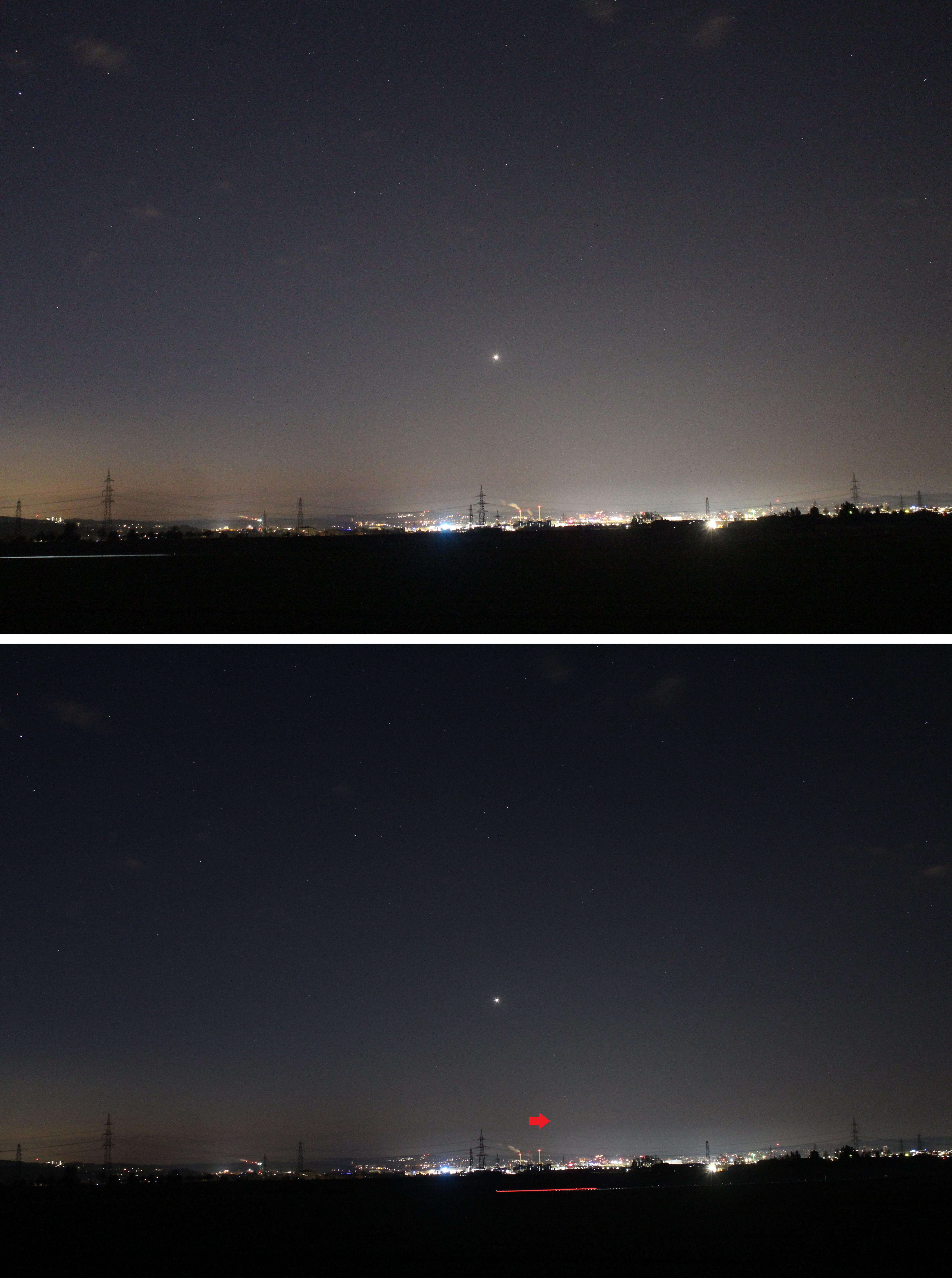 Als ich die Konjunktion der Planeten Mars und Venus am Morgen des 13. fotografierte, bemerkte ich auf einem der Bilder links unterhalb von Mars ein sternartiges Objekt, welches auf den anderen Bildern nicht zu sehen war. Zur Identifikation dieses Objektes habe ich eine Collage von zwei Bildern erstellt, wobei auf dem Bild, welches das Objekt zeigt, dieses mit einem roten Pfeil markiert wurde. Nun zu den Besichtungsdaten: