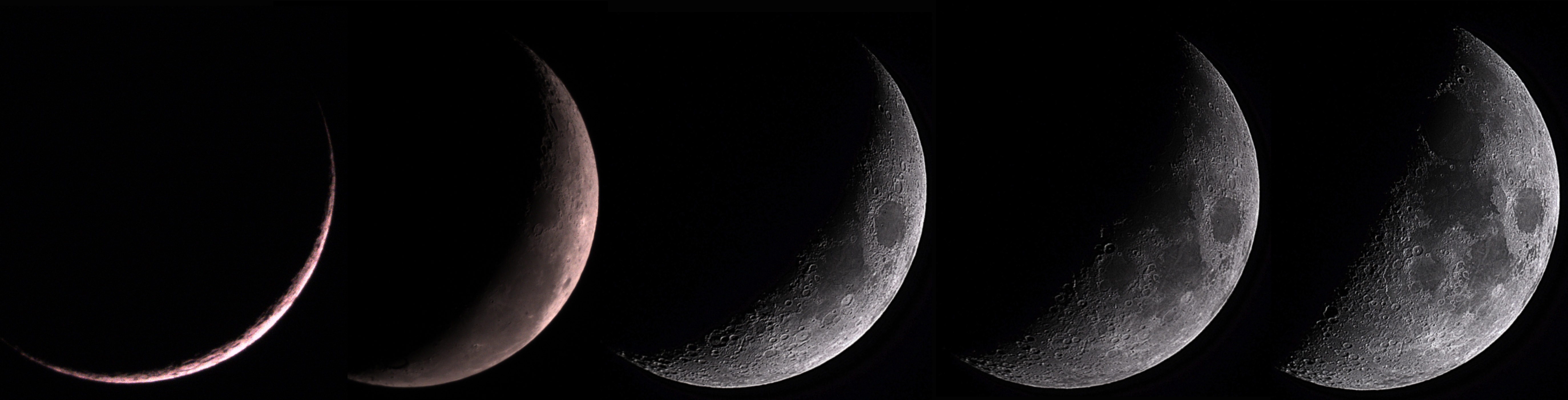 Ein faszinierendes Schauspiel ist die tägliche Zu- oder Abnahme des Mondes, die uns wohl nur deshalb so unspektakulär erscheint, weil wie sie jeden Monat wieder neu erleben. Durch die Zusammenstellung einiger Phasen wird sie hoffentlich wieder bewusster.