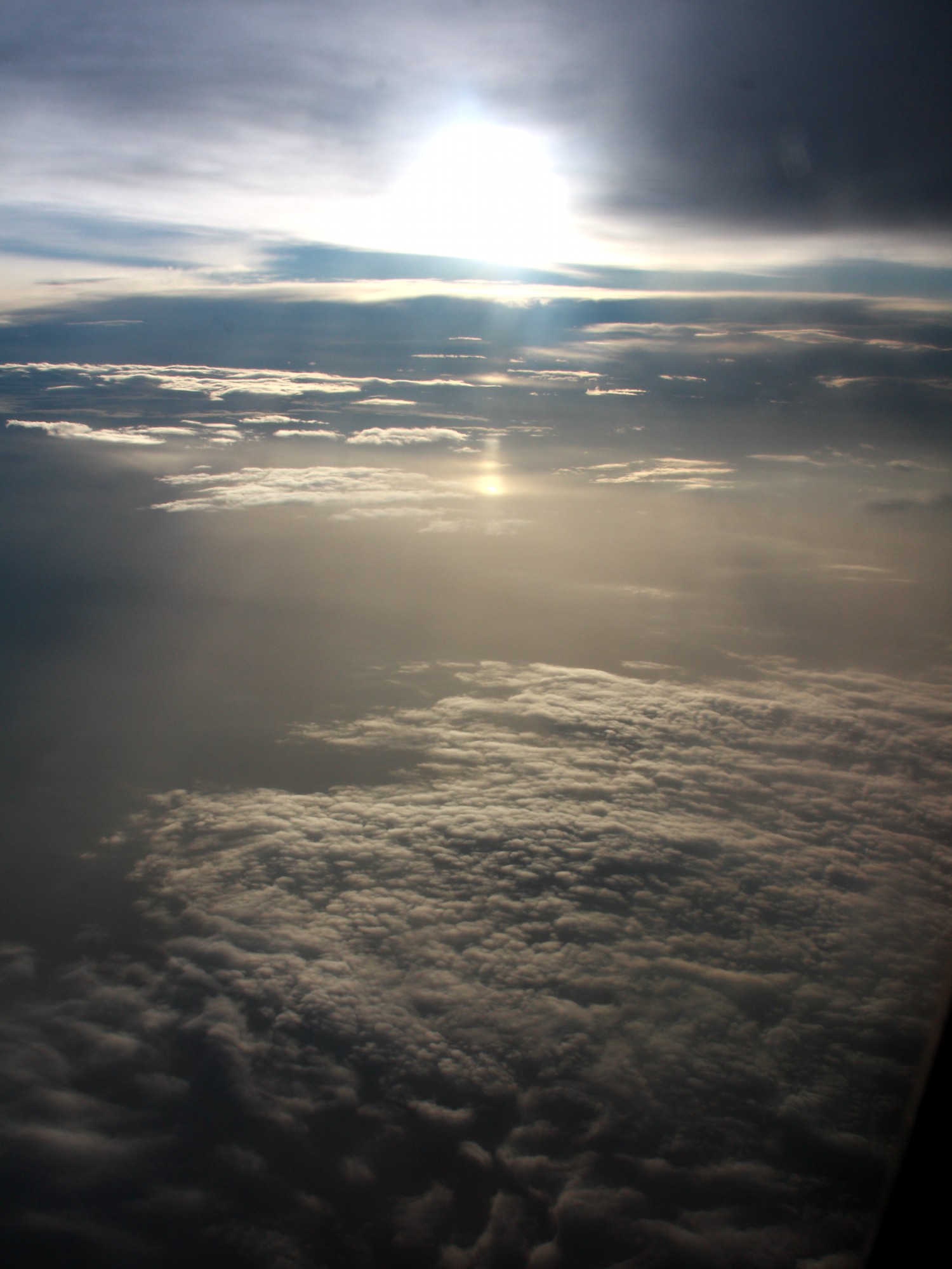 Untere Lichtsäule (mit unterer Nebensonne?) bei einem Flug von Paris nach Madagaskar, irgendwo über Ostafrika.