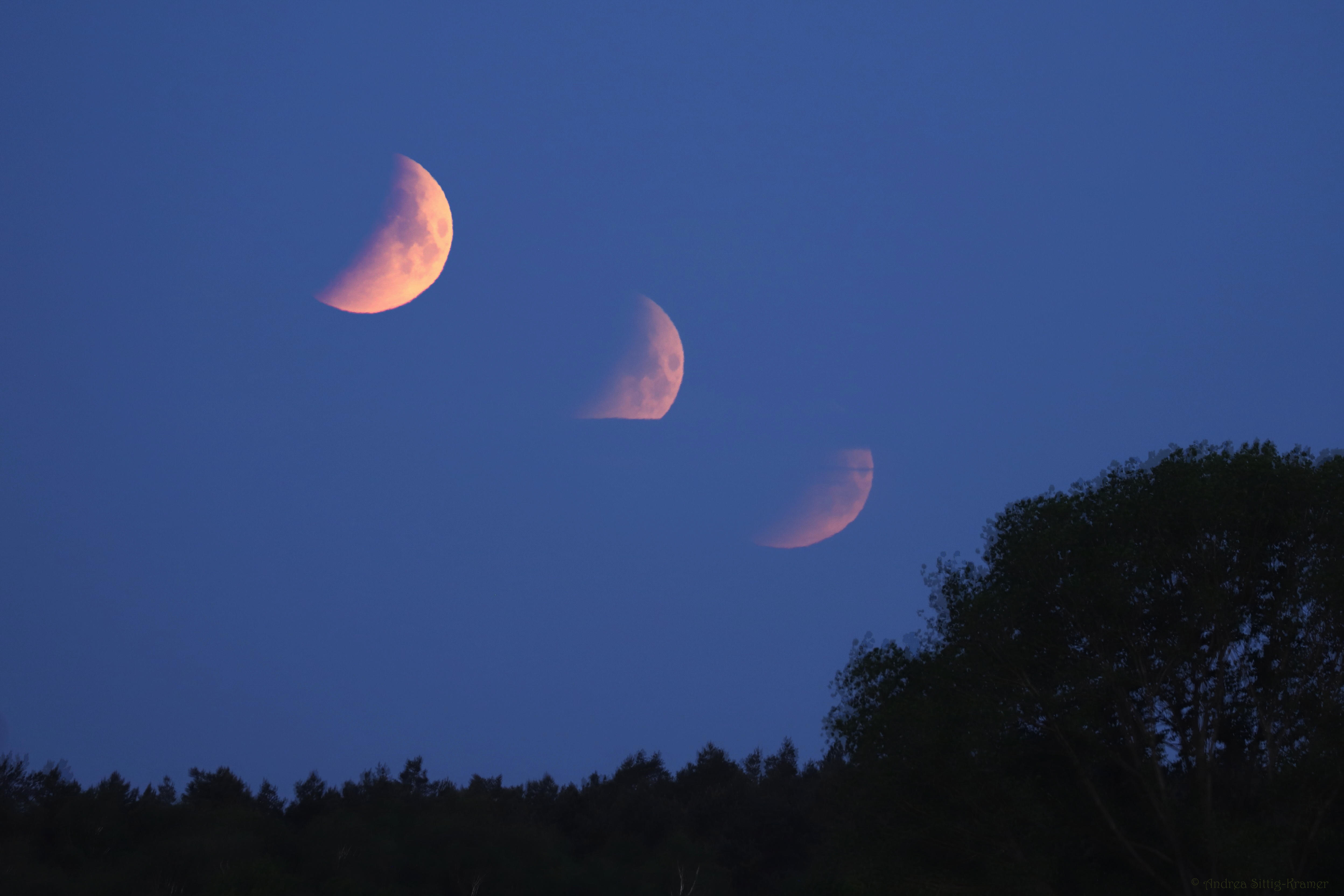 An meinem Lieblings-Spechtelplatz habe ich hervorragende Bedingungen, um auch in Horizontnähe gut beobachten zu können. Ab 03:00 Uhr hatte ich meine beiden Kameras und das Fernglas fertig aufgebaut. Ich konnte bei hbestem Wetter DAS Mondereignis des Jahres genießen. Als sich der Erdtrabant dem Horizont näherte, wechselte ich mit meiner Canon 6d mehrfach den Standort, damit ich möglichst lange freie Sicht auf den untergehenden teilverfinsterten Mond hatte. Mit dem Programm Startrails fügte ich später am PC drei dieser letzten Bilder zu einem Summenbild zusammen. Die drei Mondphasen des Gesamtbildes sind im Abstand von je drei Minuten entstanden, kurz bevor der Mond hinter zarten Wolken und dem Horizont nicht mehr zu sehen war.
