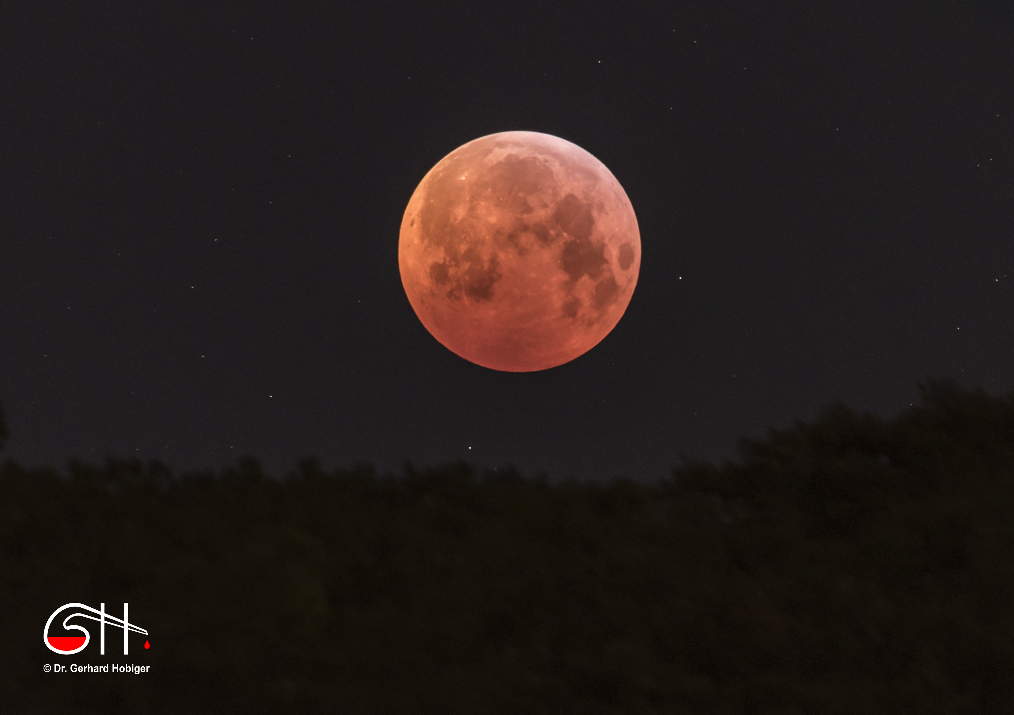 Ich beobachtete die totale Mondfinstenis am 21. Januar 2019. Durch den relativ hohen Westhorizont von meinem Standort ergab sich das Motiv des totalverfinsterten Mondes beim Untergang über dem Waldrand.