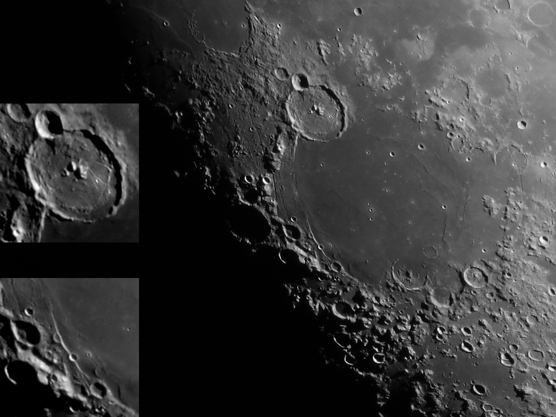 Das auffälligste Detail beim Mare Humorum ist natürlich der Krater Gassendi mit seinem detailreichen Kraterboden. Besonders die Rimae Gassendi, ein umfangreiches Rillensystem, sei hier genannt. Als besonderen Tipp möchte ich aber die Rupes Liebig, die Liebigfurche, nennen. Als Besonderheit ist hier ein »halber Krater« zu sehen, leider ist er Namenlos geblieben. Seine östliche Hälfte ist abgerutscht und von Lava überflutet worden. Auf dem kleinen Detailbild ist er schon gut zu erkennen und auch ein Ziel für kleine Fernrohre.